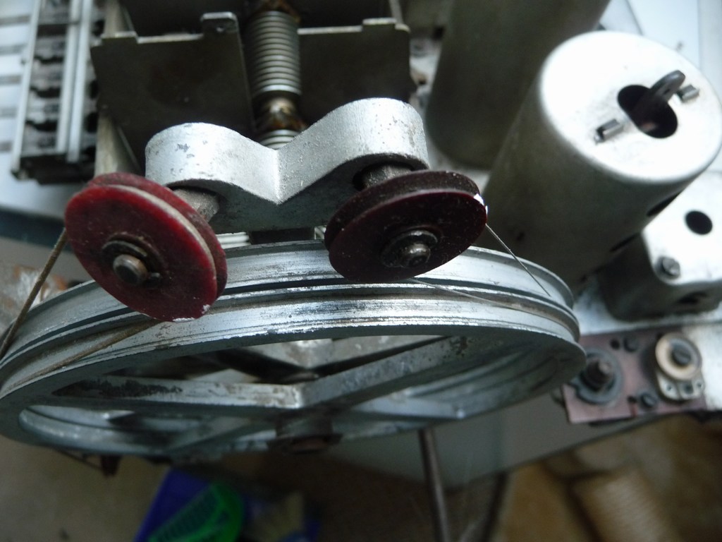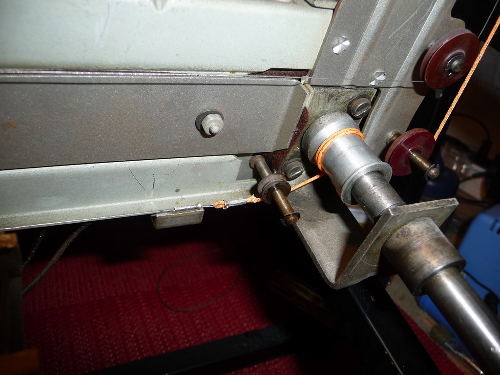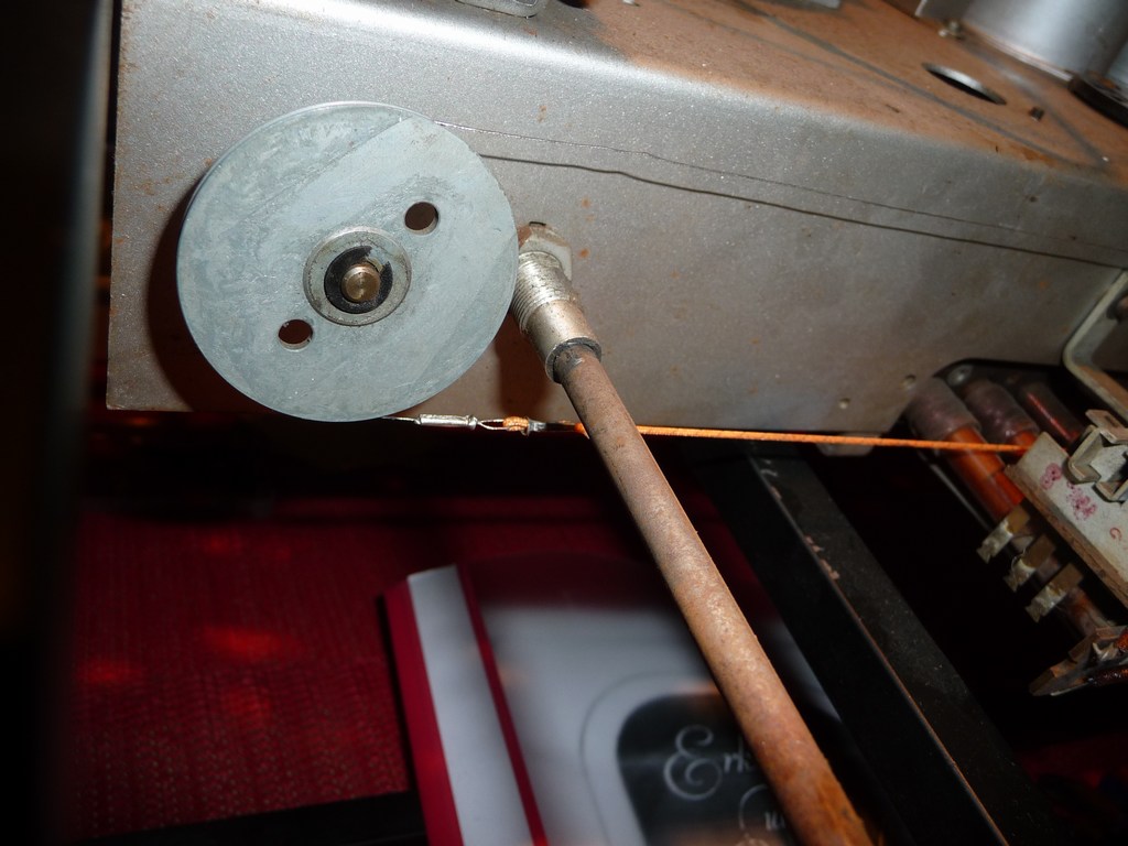 Normalerweise bewegt beim D860WK nur der Umlenkrollenhebel hinter dem Seilrad die Drehkowelle. Auf der Welle sitzen im Original zwei gleiche Seilräder und auf dem Hebel zwei kleine Umlenkrollen. Bei mir war ja nur noch ein Seilrad vorhanden und es sind Bohrungen angebracht, um es mit dem Hebel zu verbinden. Die Umlenkrollen auf dem Hebel fehlten ja ganz. Das Skalenseil bestand aus Angelsehne. Somit stimmte der Laufweg des Seiles nicht mehr und dann kommt sowas dabei heraus: