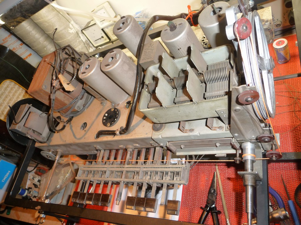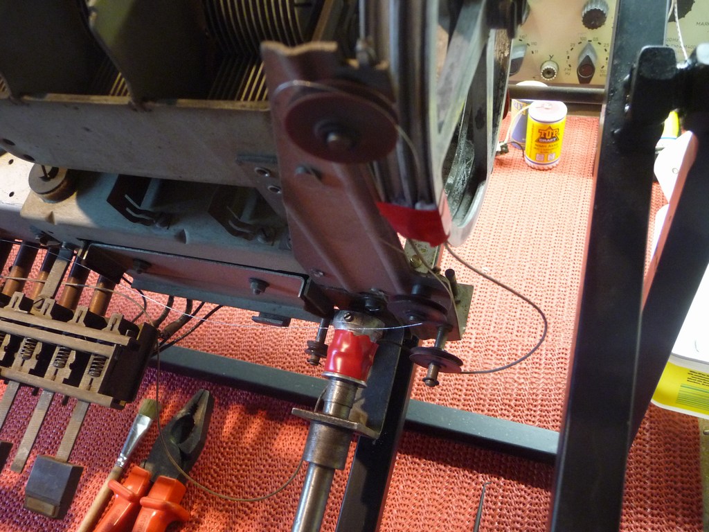Während das Umbaus bin ich noch auf einen weiteren Fehler gestoßen, es stimmten der Auf- und der Ablauf des Kunststofflseils auf die Senderwahlwelle nicht. Sie waren zwar auch unten auf der Welle, aber vertauscht (also praktisch falsch herum aufgewickelt) und somit können die Umlenkrollen links und rechts der Senderwahlwelle nicht ordnungsgemäß arbeiten. Sie folgen nämlich auf ihren langen Wellen dem Umschlingungspaket, das auf der dicken Senderwahlwelle beim Drehen beträchtlich nach vorn oder hinten wandert. Und die Länge dieser Wellen ist natürlich wieder genauestens bemessen... Hier ist gegenüber dem Foto oben sehr schön zu sehen, wie beim Drehen der Welle zum anderen Anschlag die Rollen auf den Wellen nach vorn gewandert sind: