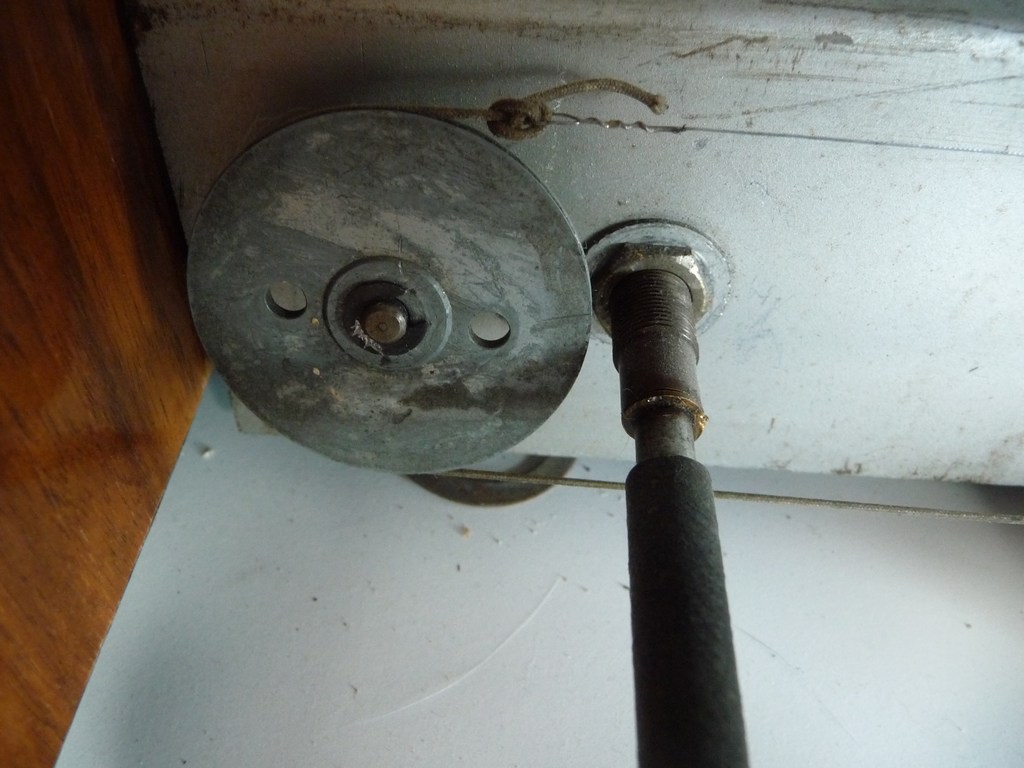Um diese Umlenkrolle muss das Stahlseil und nicht das Kunststoffseil laufen, also gehört der Knoten im Kunststoffseil nach unten. Somit war das Stahlseil zu kurz und das Kunststoffseil zu lang. Ich hatte mir aber schon vor einem halben Jahr neue Seile besorgt, also wurde alles gleich neu gemacht. So muss es sein: