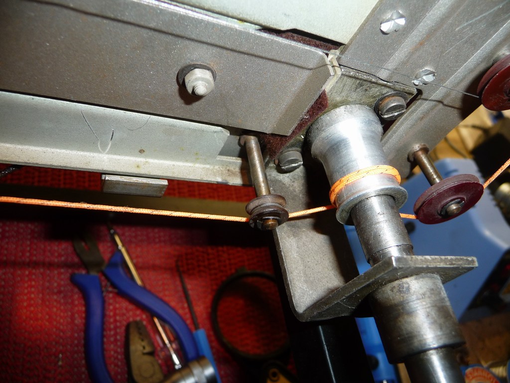 Die Kraftausdrücke, die während des Umbaus meinen Mund verliessen, möchte ich hier nicht wiedergeben. Jedenfalls habe ich jetzt den kompletten Seillaufplan im Kopf... Die jeweiligen Seillängen müssen auf's genauste stimmen, an den Anschlägen liegen die Verbindungsstellen entweder knapp an der großen Umlenkrolle im oberen Foto, oder an der kleinen Umlenkrolle hier: