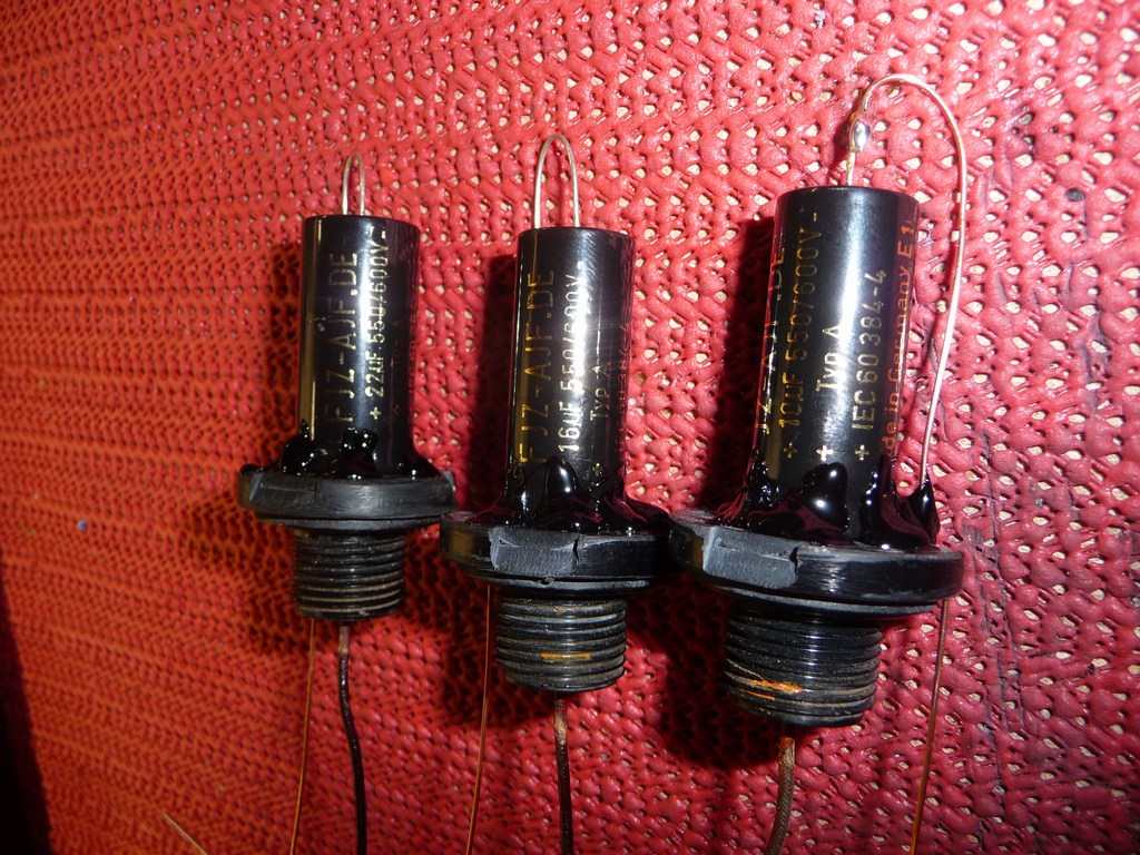 Da der erste Elko nach der Gleichrichtung ein 550/600 Volt Typ ist, habe ich gleich alle Elkos mit diesem Spannungswert ersetzt. Schaden kann es ja nichts. Bestellt habe ich sie bei den Wüstens, solche Spannungswerte sind ja Reichelt und Co nicht zu kriegen. Hier schon mal vorbereitet zum Einbau: