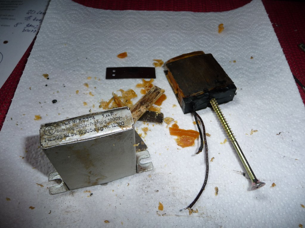 Die meisten Papierkondensatoren wurden ebenfalls entkernt und neu bestückt. Viele Werte lagen weit ausserhalb. Bei den komplett schwarzen (etwa rechts im Bild) war das nicht machbar, sie waren schon aufgerissen und lassen sich 'eh nicht neu füllen. Man kann zwar Gießformen dafür herstellen, aber das war mir dann doch zu doll...