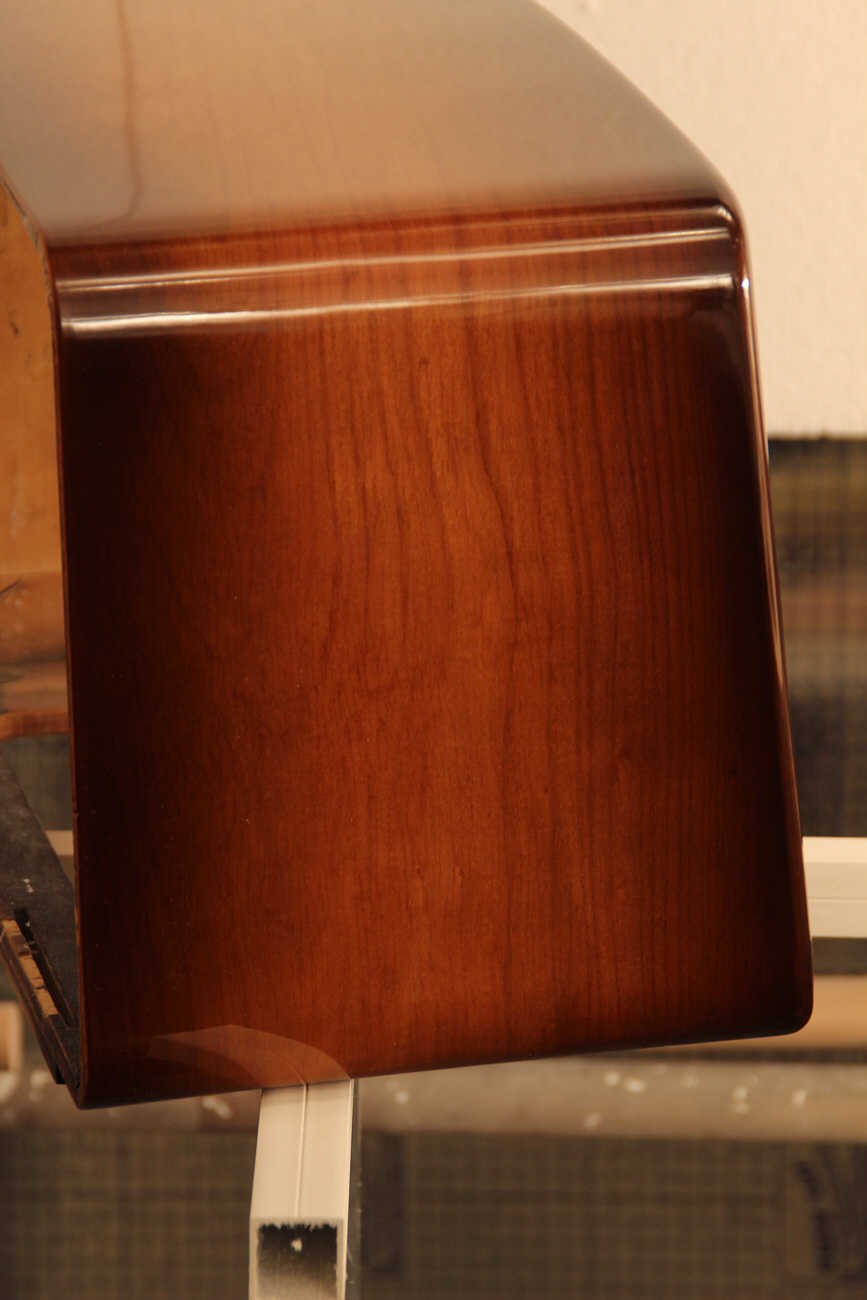 Wie man an Foto 120 sieht, ist es ja auch gar keine vollständig geschlossene Oberfläche. Der Lack ist etwas eingefallen, die Faserstruktur des Furniers schlägt ein wenig durch. Das ist selbst heute mit den modernen HS 2K-Lacken praktisch nicht zu vermeiden. Nach einigen Wochen geht das los. Alkydharz dürfte für Radios eher nicht verwendet worden sein. Die Trockenzeiten wären für die Massenproduktion zu lang gewesen. Verwendet wurde Nitrolack in vielen Schichten. Der ist natürlich auch eingefallen, war aber mit hoher Wahrscheinlichkeut hochglänzend. Wie schon erwähnt sind Nitrolacke chemisch nicht sehr widerstansfähig. Deshalb stellen sie sich heute allesamt matt dar, verbunden mit dem Durchschlagen der Holzstruktur und der Rissbildung die im Laufe der Jahrzehnte eintrat, erwecken sie heute den Eindruck einer eher seidenmatten Lackierung. Ich glaube, dass die Arbeit von Freidrich den Neuzustand des Originals ziemlich genau trifft. Dass er dafür einen neuzeitlichen Lack verwendet ist in meinen Augen nur richtig und konsequent. Angesichts der immensen Arbeit die in so einer Restauration steckt, wäre es doch unsinnig einen minderwertigen Nitrolack zu verwenden der in wenigen Jahren wieder stunpf wird. Die 2K Autolacke gehören zum Besten was man derzeit verwenden kann um langjährige Resistenz gegen Umwelteinflüsse zu gewährleisten.