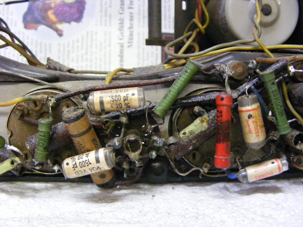Hallo Tom, Alle Teer vergossenen Papierkondensatoren sollten raus, wenige Konensatoren sind wie auf den Bildern zu sehen, schon gewechselt. Die Netzelkos solltest du Formieren, wenn noch möglich ?. Das Pfeifen kommt bestimmt aufgrund der Kapazitätsschwachen (nicht formierten) Elkos.