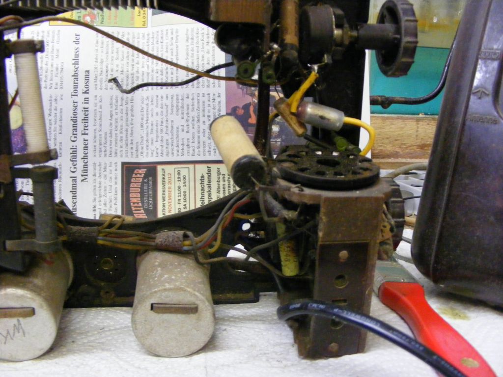 Ich habe erstmal vorsichtig mit einem Pinsel den Staub der Jahre entfernt. Die erste Prüfung der Gerätes ergab nur ein Paar Auffälligkeiten. Der Lautsprecher ist fast völlig zerissen. Ich habe ihn notdürftig geklebt und mit Papier verstärkt. Bleibt abzuwarten ob das ausreicht und der funktioniert.Das Gehäuse hat einen kleinen Riss an der hinteren Abdeckung. Bei einer der Schiebspulen hatte sich der Ferritstab gelöst, da muss ich mal sehen ob ich die richtige Position finde um ihn zu befestigen. Ein Paar Widerstände sind verfärbt. Skalenglasscheibe fehlt.Die Röhren UCH81,UF85 zeigen kaum Emission auf dem Prüfer. Die UEL51 ist in sehr gutem Zustand. Die UBF80 ist weiß(Luft gezogen).Jetzte muss ich nur noch die fehlenden bzw. verbrauchten Röhren bei mir finden. Also Trenntrafo heraus holen und los gehts. Es scheint so als wenn irgend wer da schonmal eine Reparatur versucht hat. Es gibt auffällig helle Lötstellen und schwarze Pünktchen auf manchen Kondensatoren und Widerständen.