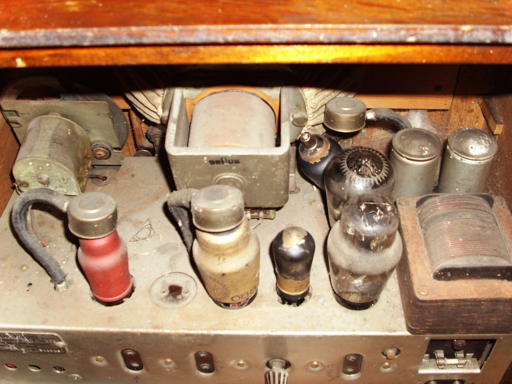 zur Röhrenbestückung ist folgendes zu sagen. Auf den Röhren lesbare Beschriftungen sind nur 4 Röhren zu identifizieren, wegen der abblätternden Farbe. AZ1,AL1,AK2 und ECF1 (rote Röhre).