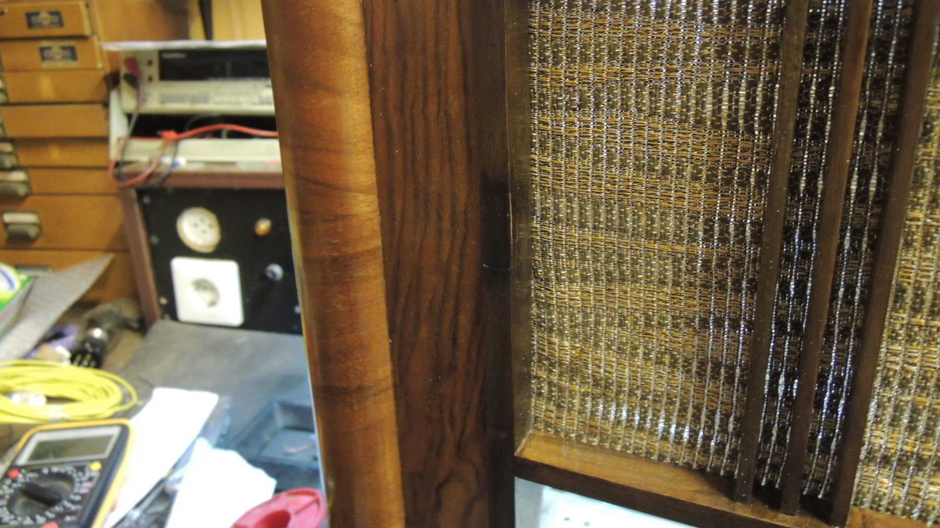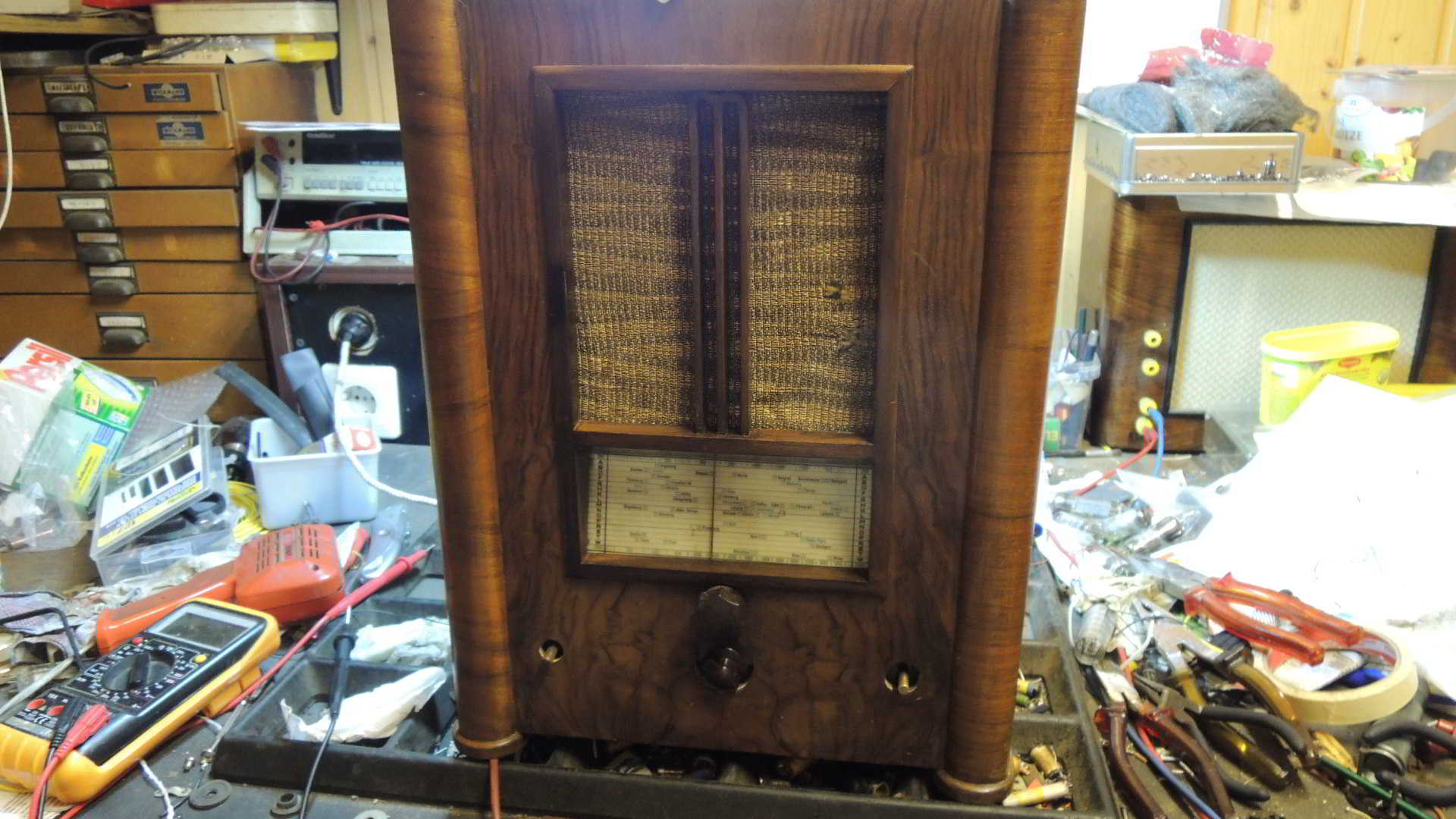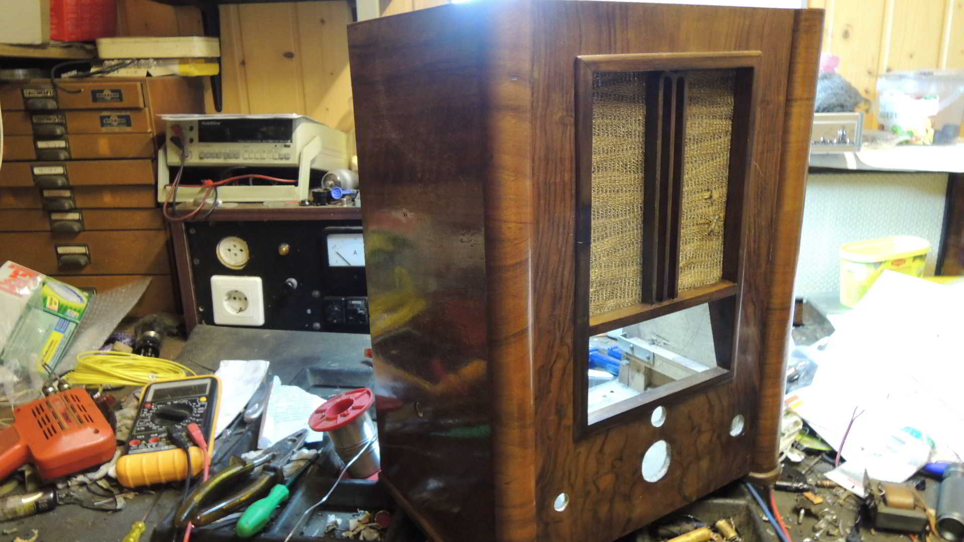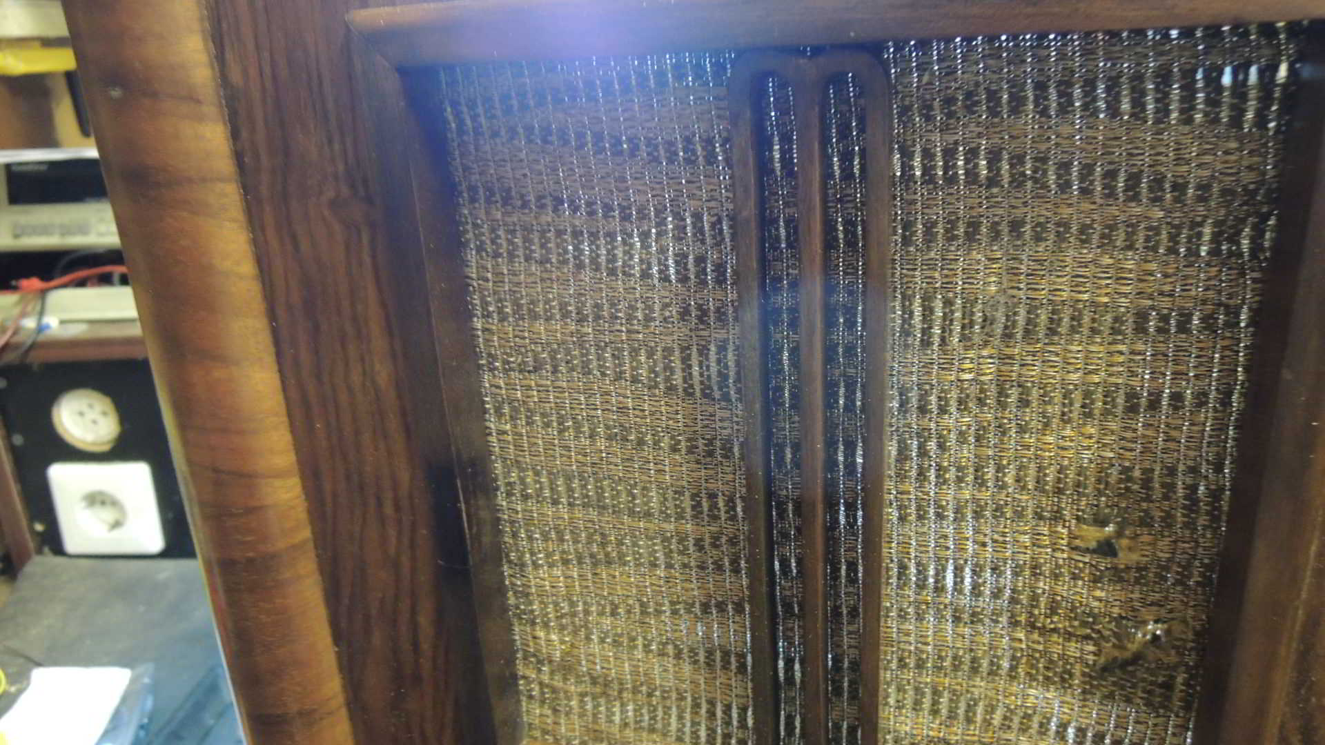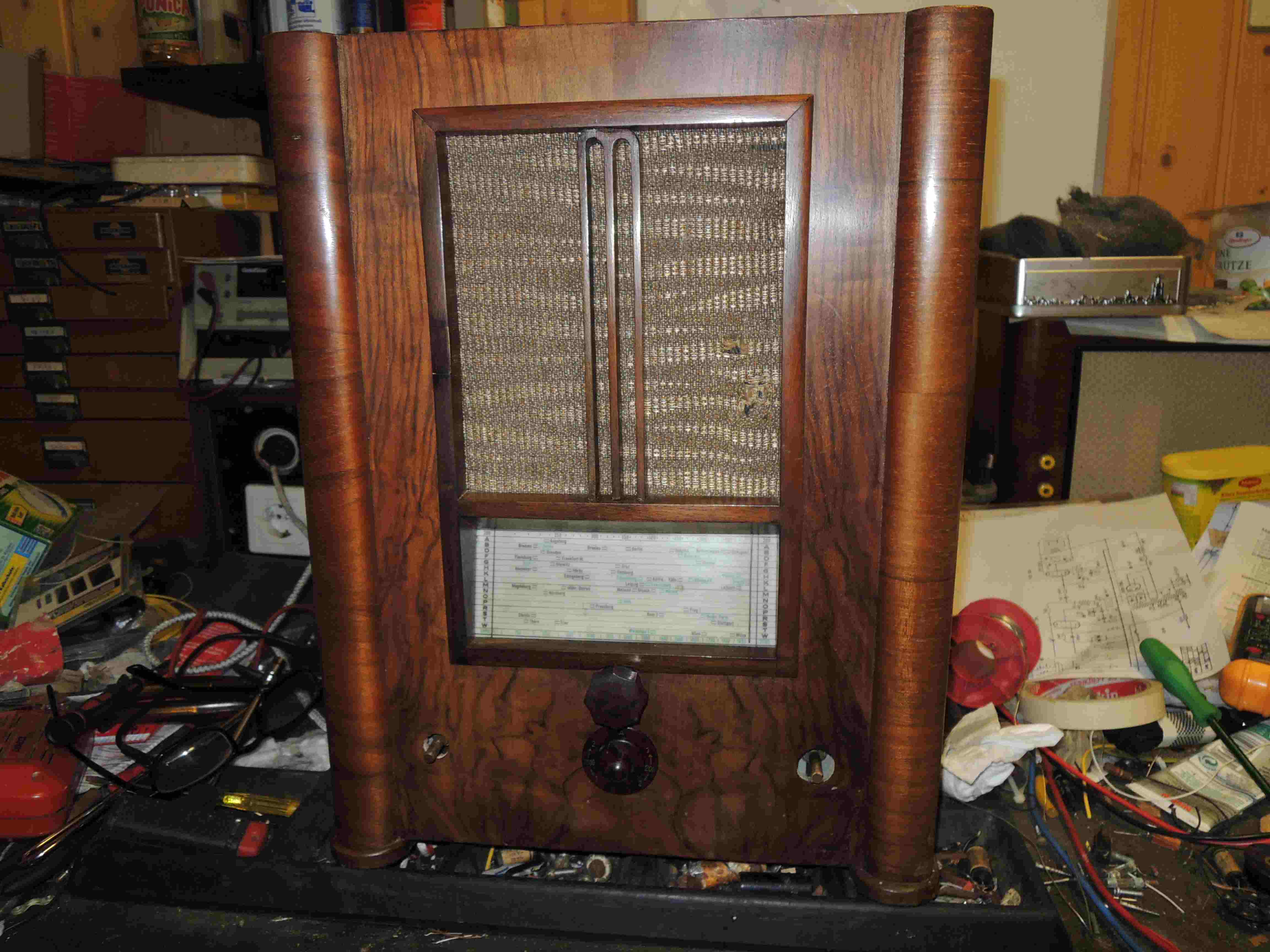 vielen Dank für Deine Anerkennung! Hat mich sehr gefreut. Nun habt Ihr ja alle das Gehäuse vorher nicht gesehen. Es war ein verwahrloster Holzkasten, bei dem erstmal der Rahmen entfernt werden mußte, weil der an der einen Seite durch irgendein Tier völlig durchgenagt war. Als das geklappt hatte (Fast, der Rahmen brach an der Knabberstelle), mußte erstmal das wellige Furnier geleimt werden. Das war aber wundersamerweise alles noch dran. Also Holzleim mit dem Spachtel drunter geschoben. Zwingen an das Gehäuse und pressen, was das Zeug hält. Das hat geklappt. Nun war der Kasten auch nicht mehr so empfindlich. Wenn unvorsichtiger Weise Furnier abbricht und verschwindet ist das ärgerlich. Nun zum Rahmen. Der mußte auch erstmal wieder stabiler werden. Ich habe das angefressene im Rahmen droßzügig rausgesägt und ein neues Stück Holz eingeleimt und die Form mit Schleifpapier (sehr grobes) der Form angepaßt. Danach wurde der Rahmen komplett mit feinerem Schleifpapier geschliffen. Der Holzersatz fiel nun kaum noch auf. Die Maserung paßt einigermaßen. Was noch fehlte war die linke Mendestrebe. Ich holte mir hier nach Muster eine Holzleiste vom Baumarkt. leimte oben einen kleinen Holzklotz an. Die Leiste mußte so schmal, wie das restliche M (für Mende)gemacht werden. Der Holzklotz wurde dann in Anlehnung an den anderen Bogen vorsichtig mit dem Dremel grob gestaltet. Danach war wieder Schleifpapier angesagt. Nach Einleimen sieht man kaum einen Unterschied. Trotz Abschleifen des Rahmens war das alte Holz dunkler, als das nachgearbeitete. Ich habe hier mehrmals dunkel gebeizt und immer wieder angeschliffen. Nachdem ich den Rahmen gebeizt hatte, fiel das Neuholz kaum noch auf. Nun habe ich Holzgehäuse und Rahmen getrennt mit Schellack lackiert. Alles glänzt wieder sehr schön. Übrigens Teile, wie das Mende-Zeichen, an das man innen nicht so dran kommt kann man durchaus auch etwas mit Schellack einpinseln. Aber sehr dünn! Dafür immer wieder.