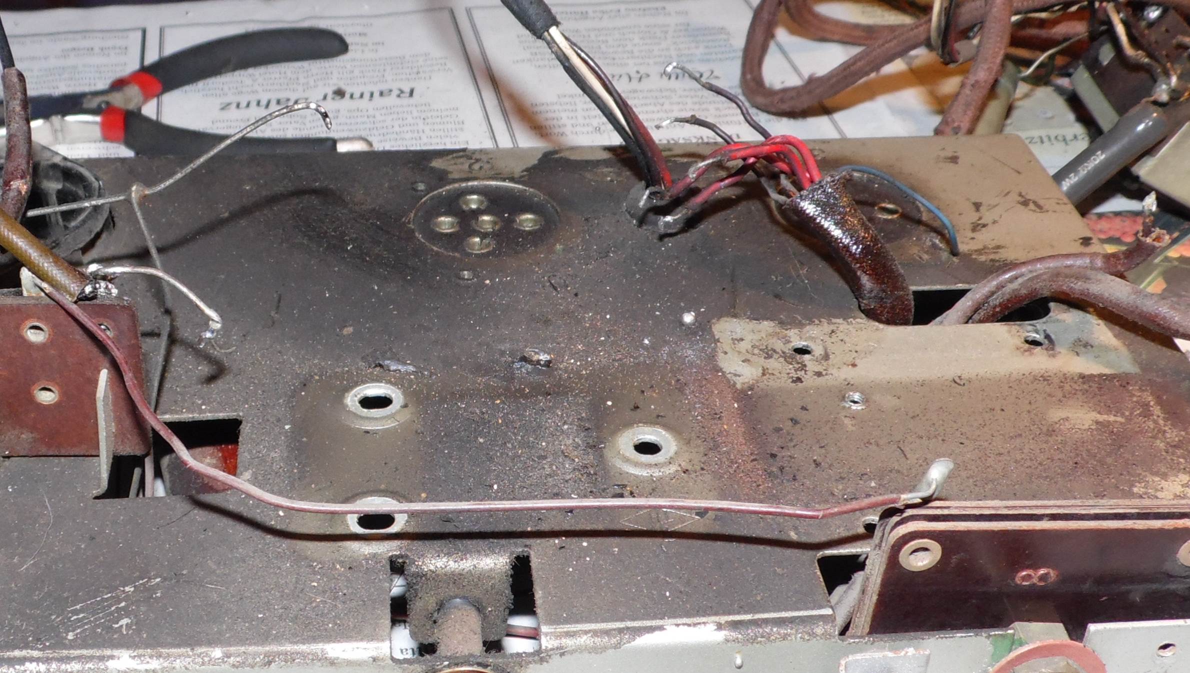 Als ich den Trafo und den Drehko gereinigt hatte, machte ich mich an das Chassis ran und Säuberte es. Das ist in den Folgenden Bildern zu sehen. So sah es aus, als der Trafo und der Drehko abmontiert waren.