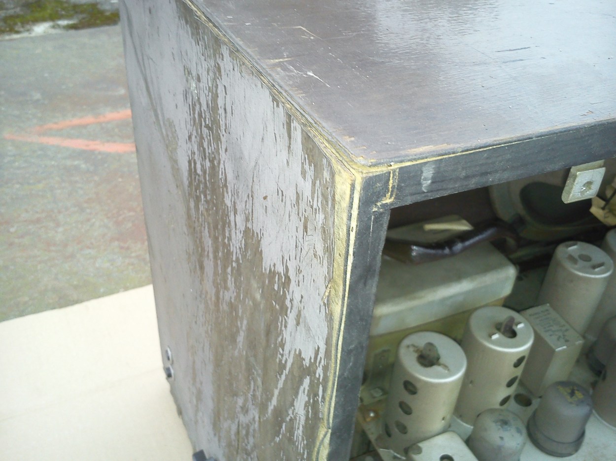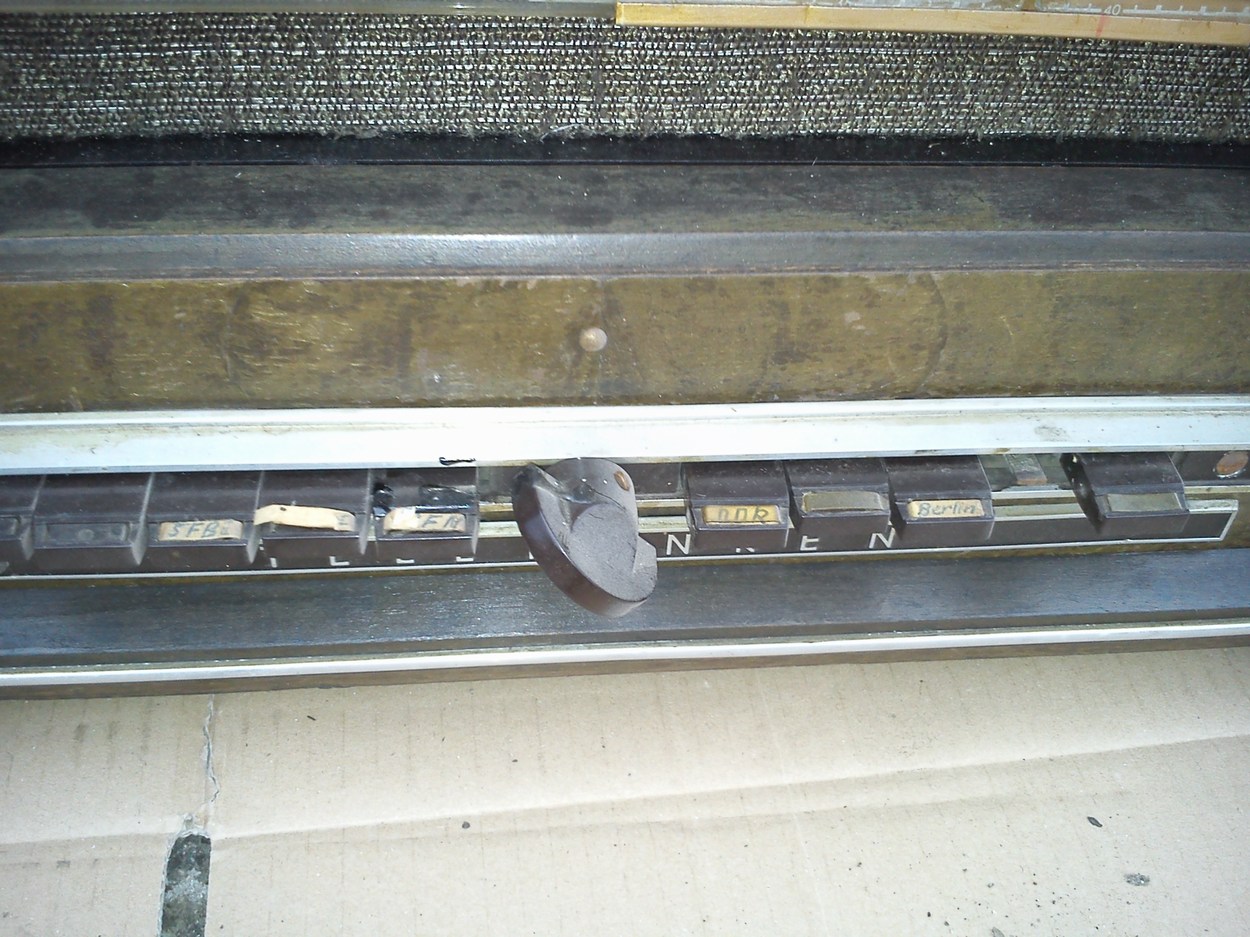 Nun das Negative: Das Gehäuse hat linksseitig -gelinde ausgedrückt- einen Totalschaden durch die aufstiegende Bodenfeuchtigkeit, stellenweise ist es nichtmal mehr vorhanden... Der Rest des Gehäuses ist nicht wesentlich besser, allein die Front scheint mir (bedingt) Erhaltenswert, der Boden ist ok, der Lautsprecherstoff könnte auch bleiben, Eine Glasskala ist gebrochen und wurde irgendwie repariert, die restlichen Skalen darf man kaum schief angucken, dann ist der Aufdruck dahin...