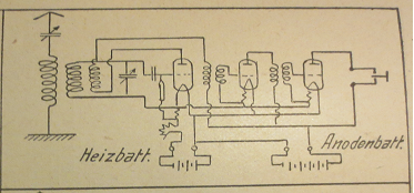 die Spannungsversorgung ist natürlich immer von den verwendeten Röhren abhängig. Die frühen Röhren (Trioden) brauchten 60-80V Anodenspannung und 4-6V /4Ah für die Heizung. Die Heizspannung wurde mit einem Drahtpoti geregelt. Bei mehreren Stufen mussten die Radioamateure dementsprechend mehr Heizleistung zur Verfügung stellen, ansonsten musste häufig nachgeladen werden. Hier übrigens ein weiteres Schaltschema. Es geht natürlich auch ohne den kleinen C den ich in der Skizze im Rückkopplungskreis eingesetzt habe. Wahrscheinlich wurde ja mit einem Übertrager gearbeitet. Die Rückkopplungsspule und die Primärseite des Übertragers liegen dann direkt in Reihe zur Anode. Allerdings müsste Dein Empfängerkreis dann eigentlich vier Anschlüsse zum Röhrenmodul haben. Ich sehe da eher die Variante 1.....wenn eine Masseverbindung (Gehäuse) am Rückkopplungs- schwenker besteht. Das fehlende Röhrenmodul ist wahrscheinlich mit einem Poti und einem Übertrager ausgestattet gewesen. Ohne Deinen Spulenvorsatz, wäre das dann ein kleiner Kopfhörerverstärker gewesen. Da hätte der begeisterte Radioamateur vielleicht ein Mikrofon oder einen Detektor angeschlossen.