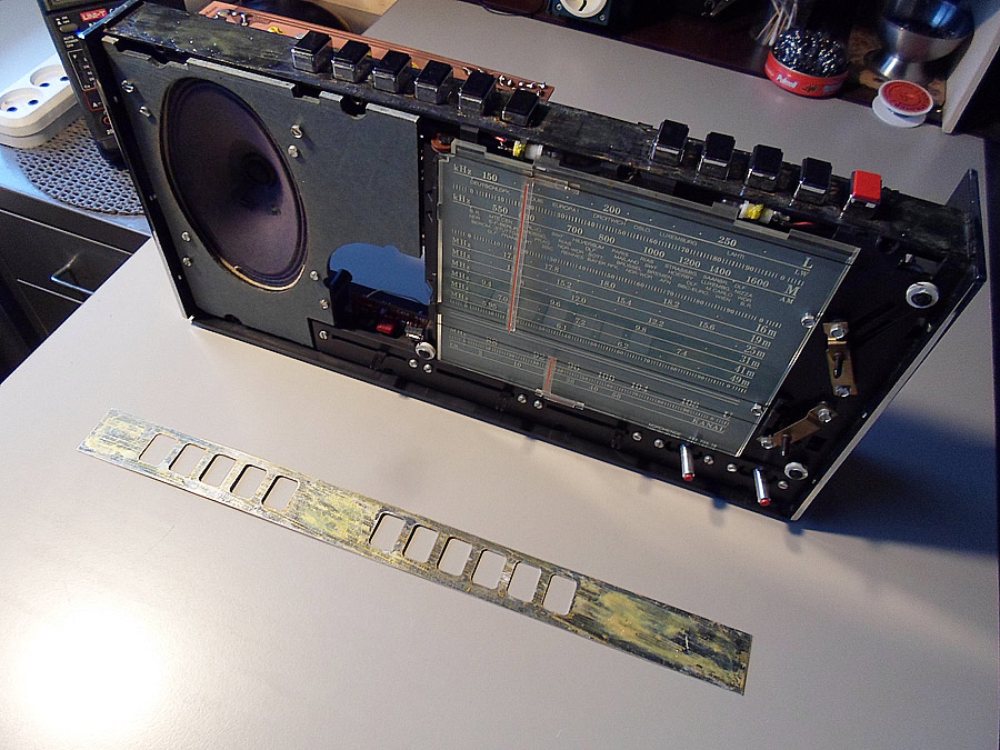 Und ich mache weiter. Das Skala Glas ist jetzt befreit von Aufkleber und aufpoliert. Alle schwarze Teile vom Gehäuse, die verschmutzt waren, sind neu lackiert. Die komplette Mechanik war sauber gemacht; neu eingeschmiert und eingestellt. Die Wellenbereich Schalters, Potis sind sauber gemacht und eingeschmiert.