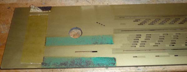Für die Skalenscheibe habe ich auch eine Lösung gefunden, wie sich das korrodierte 'Gold' reparieren lässt. Mit einer gut verdünnten Mischung aus Salzsäure und Wasserstoffperoxid, wie man es in konzentrierterer Form zum Ätzen von Kupfer braucht, konnte ich das korrodierte, grünspanige 'Gold' wegätzen, wobei die braune Farbe darunter nicht angegriffen wird, und auch die noch gute Goldfarbe wurde kaum angegriffen. Nach gründlicher Reinigung und Ausbessern von ein paar durchgefressenen Stellen der braunen Grundfarbe habe ich neue Goldfarbe aufgespritzt. Das Ergebnis lässt sich durchaus sehen im Vergleich zum vorherigen, hässlichen Grünspan (ist beim Foto am Anfang noch zu sehen, wenn auch etwas unscharf). Die zum Teil angegriffenen Feinst-Strukturen habe ich nicht versucht zu restaurieren, dazu fehlen mir die Mittel, und man darf dem Gerät ja ansehen, dass es schon ein paar Jahre auf dem Buckel hat.