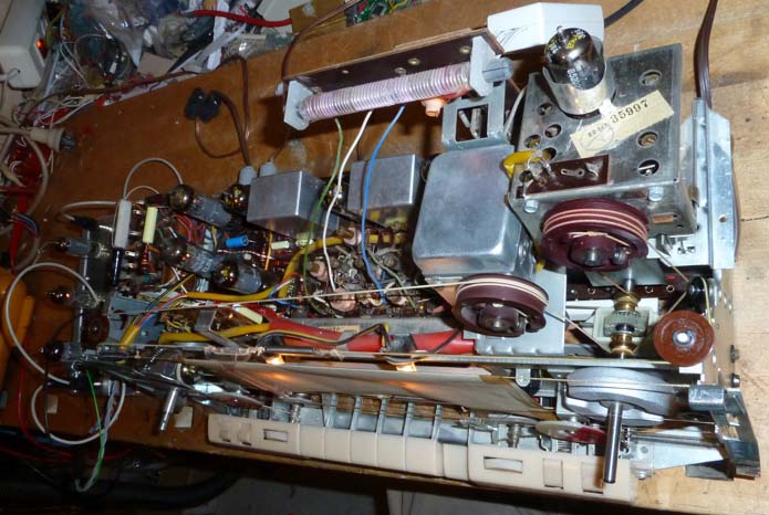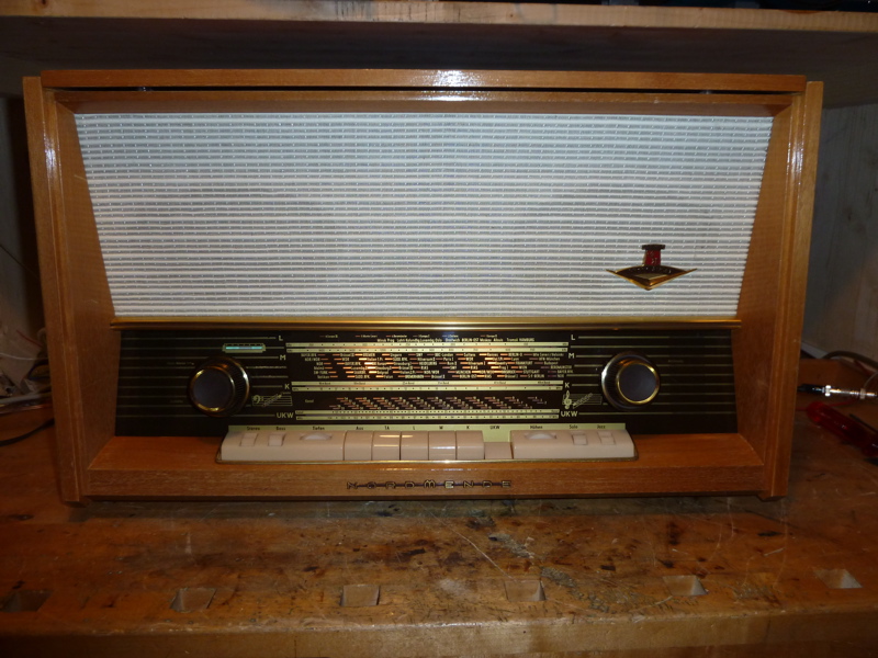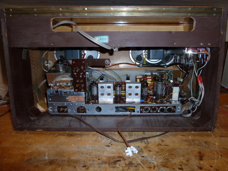 Das Gerät funktioniert wieder. Der Anodenspannungs-Elko war nach etwa 3 Stunden Formierung wieder fast neuwertig. Als Nächstes werden noch die letzten Papierkondensatoren getauscht und der Abgleich kontrolliert, danach kommt das Gehäuse dran. Danach baue ich meinen Röhren-Stereodekoder ein, so hat er ein würdiges Plätzchen. Der Ton mit externen Boxen war jedenfalls schon erstaunlich gut, insbesondere die Basswiedergabe, die ja bei einfachen Röhrenendstufen nicht gerade berauschend ist.