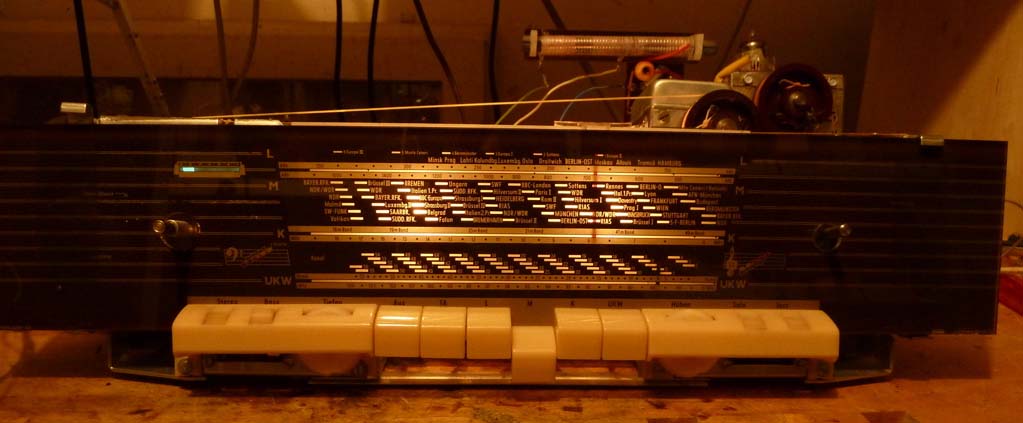Die Skalenlampen haben schon einige Betriebsstunden... damit das neue Diffusor-Papier nicht wieder angeschwärzt wird, habe ich sie etwas zurückgebogen, so dass sie das Papier nicht mehr berühren.