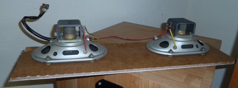 Die Schallwand von hinten mit den beiden Lautsprechern. Netterweise wurde hier ein Stecker für den Lautsprecheranschluss spendiert, so dass nichts abgelötet werden musste. Allerdings nicht ganz ungefährlich: in der Musiktruhe 'Traviata', die ich kürzlich bei einem Kollegen kontrolliert hatte, ist dasselbe Chassis verbaut (gleicher Schaltplan!) mit demselben Stecker, aber dort ist die Netzspannung für den Plattenspieler angeschlossen. Somit ziemlich fatal, wenn man zwei 'gleiche' Chassis einfach tauscht...