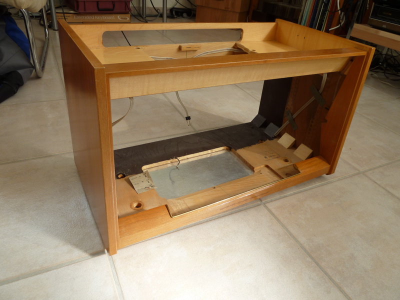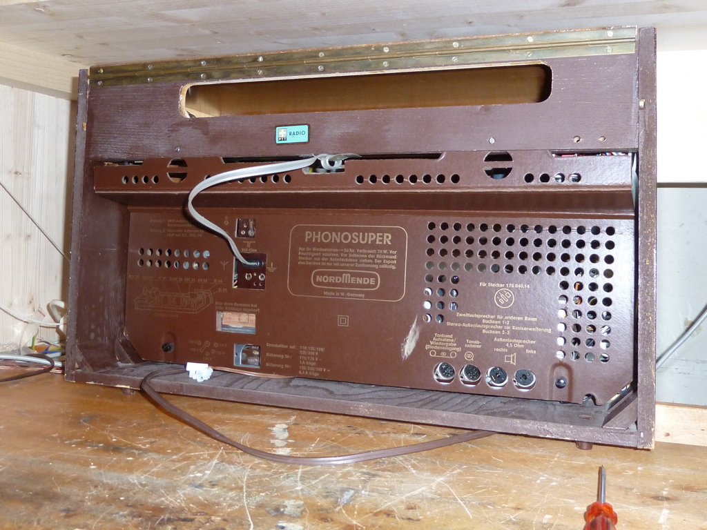 Äusserlich ist das Gerät noch in einem ganz ordentlichen Zustand, lediglich ein paar oberflächliche Kratzer und frontseitig stellenweise kaum mehr Lack. Etwas anschleifen und 1..2 mal lackieren sollte hier ausreichen. Weiter hat jemand noch dieses komische Holzkästchen oben links eingebaut. Wozu das sein soll, weiss ich nicht, zudem sind die Kabel abgeschnitten, so dass ich es wohl am besten entferne.