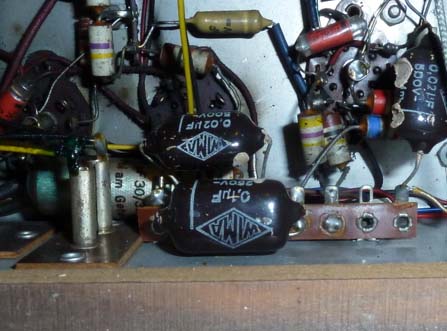 Beim technischen Zustand habe ich als positiven Befund keine Basteleien gefunden, ausser das Drahtpoti im Lautsprecherpfad, das es nach Schaltplan nicht gibt. Hingegen stachen mir ein paar 'böse' Wima-Bonbons ins Auge, diese werden auf alle Fälle ersetzt: