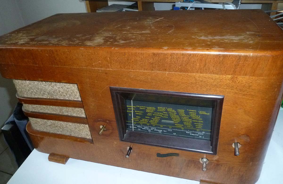 Die Kondensatoren waren noch alle in Ordnung, inklusive den Elkos, was mich ziemlich erstaunte, denn sie sind ja mittlerweile 80 Jahre alt. Nur der Netzschalter wollte nicht, aber sonst funktioniert das Gerät und ist ausserordentlich empfindlich und auch trennscharf. Trotz der sehr niedrigen ZF von nur 130kHz wird die Spiegelfrequenz gut unterdrückt, und die Tonqualität ist sehr gut.