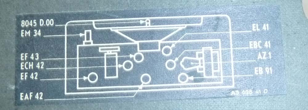 Elektrisch hat es auch ein paar Besonderheiten. Für AM ist es noch 'normal': ECH42, dann ein zweistufiger ZF-Verstärker mit EF43 und EAF42, wobei die Diode der EAF42 als AM-Demodulator verwendet wird. Für UKW gibt es eine HF-Stufe mit der EF42, danach wird ebenfalls die ECH42 als Mischer und Oszillator verwendet, was ziemlich abenteuerlich ist, da einerseits diese Röhre nicht für so hohe Frequenzen gedacht ist und andererseits durch die notwendigen Umschalter die Leitungen für UKW unnötig verlängert werden, was sehr schädlich ist. Danach folgt derselbe ZF-Verstärker wie für AM, einfach mit den 10.7MHz-Filtern. Als Demodulator dient ein Ratiodetektor mit einer EB91. Der NF-Pfad hat es auch in sich. Als NF-Vorstufe dient die EBC41, wobei die beiden Dioden keine Funktion haben. Als Endstufe dient die EL41. Die Kathodenwiderstände sind nicht mit Elkos überbrückt. Um den Verstärkungsverlust durch die Gegenkopplung zu kompensieren, gibt es eine Rückkopplung von der Kathode der Endstufe zur Kathode der Vorstufe, eine interessante Variante, und erspart die Prüfung eines verdächtigen Kondensators. Weiter gibt es von der Sekundärwicklung des Ausgangstrafos zur Vorstufe eine Gegenkopplung, in der auch eine Klangregelung eingebaut ist. Dabei können die Höhen mit einem Poti abgeschwächt werden, während für den Bass ein Schalter vorhanden ist. Die Heizung der EBC41 ist ebenfalls speziell: Damit vom Heizfaden kein Brummstrom eingespeist werden kann, wird diese Röhre über eine separate Wicklung geheizt, die über einen Spannungsteiler gegenüber der Kathode positiv vorgespannt ist. So wird bei einer allfälligen Elektronen-Emission des Heizfadens (parasitäre Diode) ein Stromfluss zur Kathode verhindert.