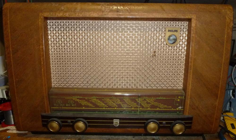mir ist dieses Philips-Radio zugelaufen und will mir einfach seinen Namen nicht nennen. Auf dem Typenschild fehlt netterweise die Typenangabe oder dann ist sie spurlos verschwunden. Das Gerät wurde in der Schweiz in den 50er-Jahren verkauft und hat LW, MW, KW und UKW sowie einen Plattenspielereingang. Es hat keine Ferritantenne. Die Beschriftungen auf der Skala sind alle französisch, auch die Sendernamen. Bestückt ist es wie folgt (Reihenfolge dem vermuteten Signalpfad entlang): EF42, ECH42, EF43, EAF42, EB91, EBC41, EL41, AZ1, EM34. Diese Bestückung deutet auf eine kreative, unkonventionelle Lösung für UKW und auf Grund der Filteranordnungen auf 2 AM/FM-ZF-Stufen. FM-Demodulation dürfte ein Ratiodetektor mit der EB91 sein. So wie das Chassis aussieht, war da in früheren Versionen ebenfalls eine Rimlock-Röhre, aber hier ist die EB91 original, so steht es auch auf der Rückwand. Auffallend sind die sehr kleinen ZF-Filter, zudem sind die AM- und FM-Filter in separaten Schirmhauben.