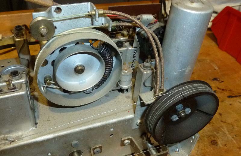 Das Gerät hat diverse Spezialitäten, daher stelle ich es hier etwas genauer vor. Es beginnt bei der Mechanik: Der Drehkondensator ist gummigelagert, vermutlich um Mikrophonie auf UKW zu vermeiden. Der Seilzug ist als Bowdenzug ausgeführt, damit vom Chassis keine Kräfte auf den Drehko ausgeübt werden, siehe Bild: