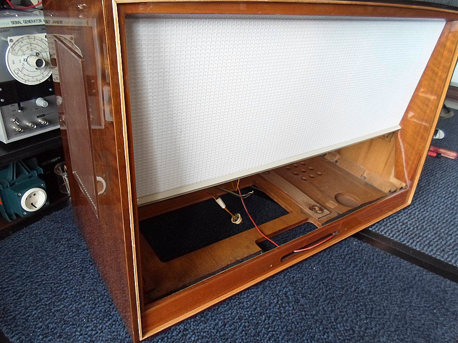 Allerdings...der Schallwandstoff sieht furchtbar aus...braun von Nikotin oder einfach von den Jahren. Das Gerät stand zeitlebens in einer Kneipe... Eine fachgerechte Restaurierung (Waschen/Wiederanbringen oder, wahrscheinlich nötig, Neubezug) traue ich mir nicht zu. Man liest da ein paar Dinge im www...