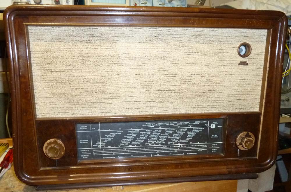 Der MW-HF-Teil wurde offenbar mal 'nachgeglichen', der Kern von der 2. Schwingkreisspule war defekt und die Frequenzen auf der Skala stimmen nicht. Ich gehe davon aus, dass der Bereich etwsa nach oben ausgedehnt wurde, um den Sender 'Sarnen' auf 1566kHz empfangen zu können, der MW-Bereich bei diesem Gerät aber noch nach alter Sitte bei 1500kHz endet. Dafür geht die Langwelle bis 405kHz, dann stimmt es im Schnitt wieder