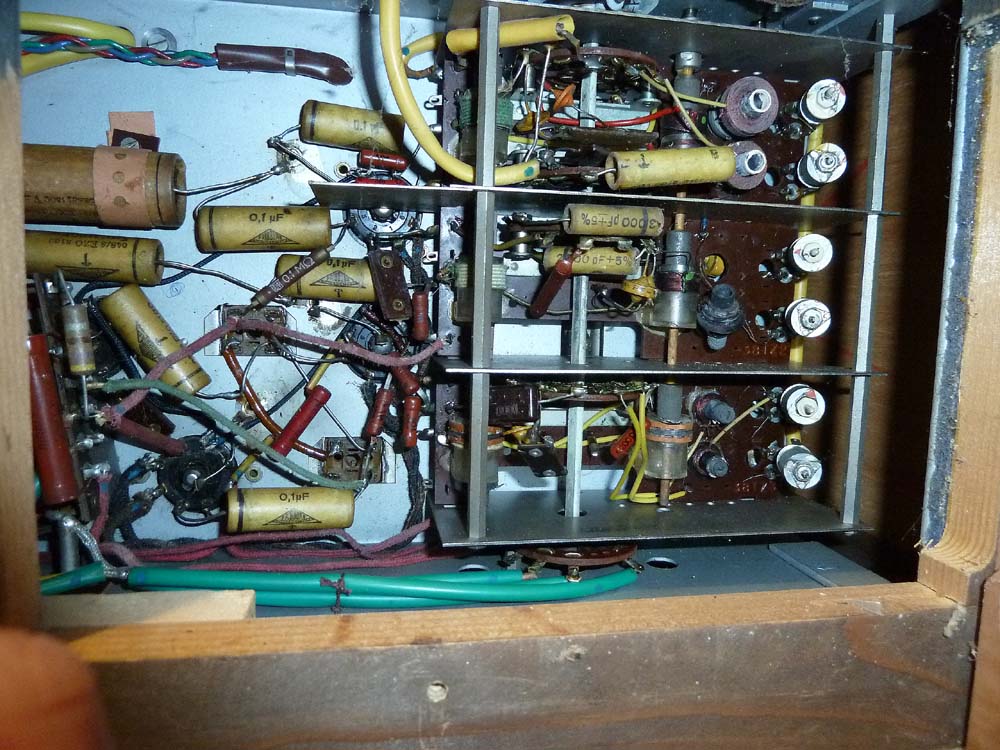 Elektrisch habe ich das Gerät wieder flott gemacht, der Aufwand hielt sich in Grenzen. Ausnahmsweise waren nicht die Kondensatoren, sondern Widerstände Wechselkandidaten. Bei den Kondensatoren habe ich nur aus Sicherheitsgründen die Koppelkondensatoren und ein Abblockkondensator getauscht. Es hatte sich einmal mehr gezeigt, dass die 'Condensateur Fribourg' von ausgezeichneter Qualität sind. Die ersetzten Kondensatoren habe ich testweise bei 300V geprüft, der Leckstrom war <30uA und tendenziell sinkend, was zwar für einen Koppelkondensator kritisch ist, aber für einen Abblockkondensator völlig unkritisch. Die Elkos waren ebenfalls in hervorragendem Zustand und mit 550V Spannungsfestigkeit auch nicht von schlechten Eltern. Bei den Widerständen hatte ich das Gefühl, dass gerade verbaut wurde, was verfügbar war. Bunt gemischt ist hier Ingelen, Siemens, Paillard und Vitrohm, Vitrohm fast alles Wechselkandidaten.