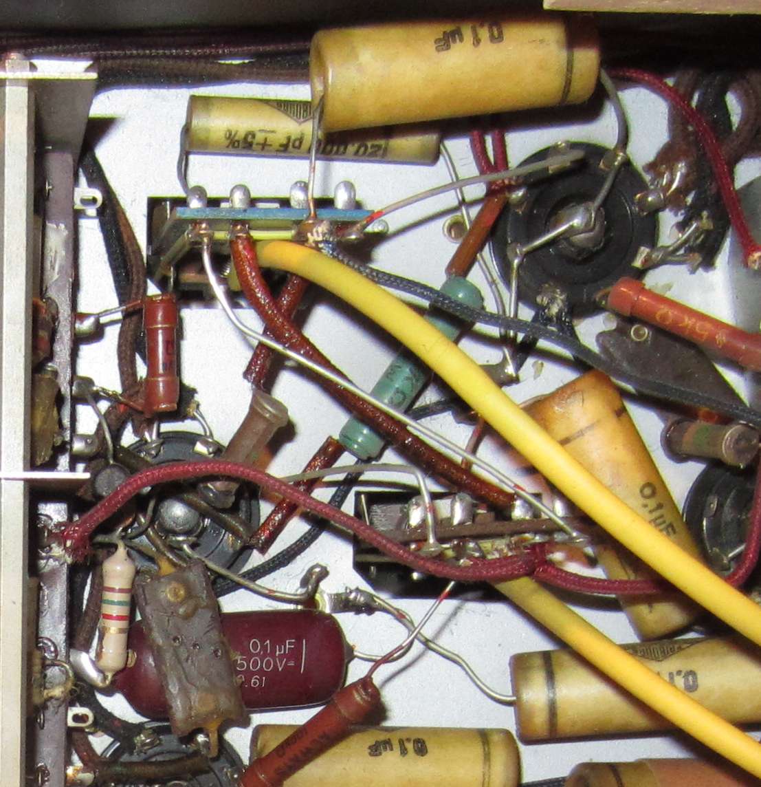 Bei diesen Reparaturen sind mir noch weitere Schaltungsdetails aufgefallen. Für die beiden Kurzwellenbänder wird die Schirmgitterspannung der beiden ZF-Stufen und des Mischers erhöht, was für Kurzwelle eine höhere Verstärkung ergibt. Beim hochfrequenten Kurzwellenband (K1) wird zusätzlich noch der Kathdenwiderstand der HF-Vorstufe überbrückt, was nochmals etwas Verstärkung und auch zusätzliche Empfindlichkeit bringt. Im NF-Pfad gibt es bei Radioempfang noch eine geringe Anhebung der Frequenzen im Bereich ab ca. 4kHz, damit der Klang etwas heller wird. Bei Plattenspielerbetrieb wird diese Korrektur abgeschaltet. Interessant ist noch, dass bei Plattenspielerbetrieb nur das magische Auge und der Oszillator abgeschaltet wird, alle anderen Röhren arbeiten normal weiter.