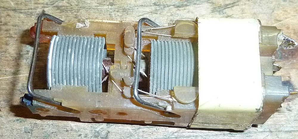 Er besteht aus drei grossen und drei kleinen Kondensatoren. Für LW und MW wird jeweils ein grosser und ein kleiner parallelgeschaltet, für KW2 wird nur der grosse und für KW1 nur der kleine verwendet. Dadurch wird die Schwingkreisgüte optimal, dafür braucht es ebenfalls zusätzliche Umschaltkontakte.