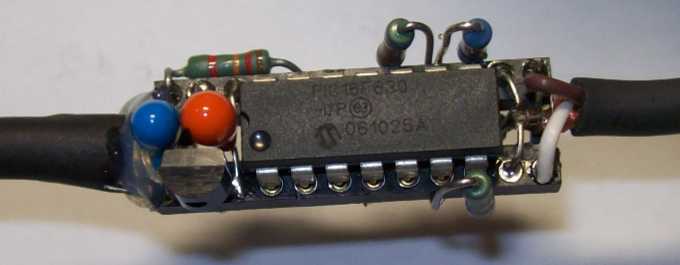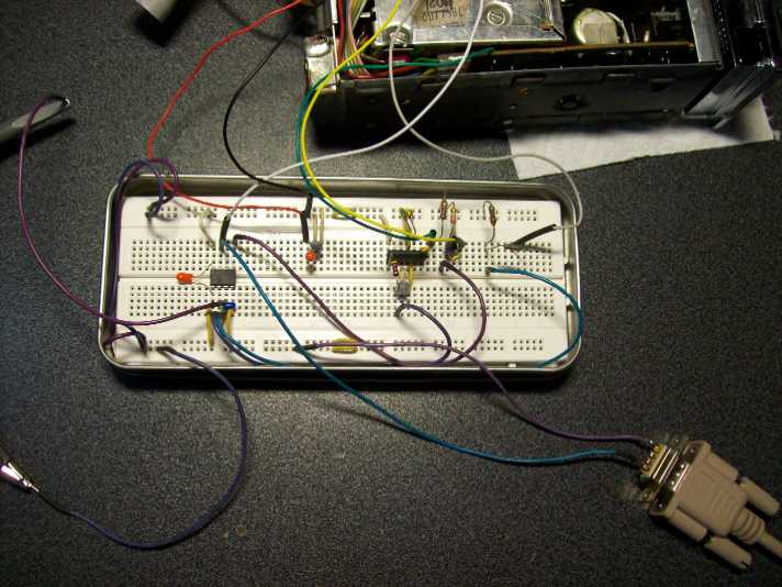In dem kleinen Modul wird dann ein Datentelegramm geschnürt und über einen bis dato unebschalteten Pin der rückwärtigen Diodenbuchse im Frankfurt an das Handschuhfach geschickt. Dort empfängt eine "Kabelverdickung" das Telegramm und emuliert den Joystick.