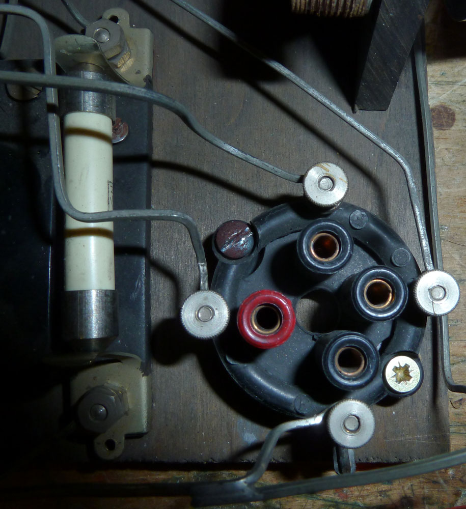 der Kopplungsgrad zwischen L2 und L3 kann von aussen mit dem mittleren Knopf eingestellt werden, dazu ist L3 schwenkbar. Neben dem unkonventionell geschalteten Schwingkreis fällt auch auf, dass es keine Abblock-Kondensatoren gibt. Neben den unerwünschten NF-Kopplungen über die Heizung gibt es ja noch den notwendigen HF-Pfad der Rückkopplung, der von C2 über die positive Betriebsspannung nach Masse fliessen muss, dazu gibt es nur den Weg über die (eher langen) Anschlusskabel und die Spannungsquelle. Auch der HF-Siebkondensator C6 am Gitter der Endstufe ist nicht auf Masse geschaltet, so dass die Verbindung nach Masse über das Anschlusskabel und die Batterie für die Gittervorspannung erfolgt. Aber es funktioniert...