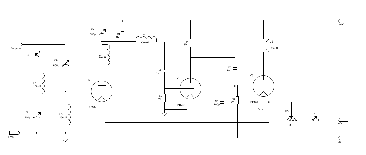 Die Schaltung weicht etwas vom Gewohnten ab: L1 und C1 bilden einen Sperrkreis, der mit S1 zugeschaltet werden kann. L2 und C3 bilden den Schwingkreis, dabei liegt die Antenne in Serie und ist daher sehr entscheidend für die Eigenschaften des Schwingkreises. Insbesondere muss sie genügend lang sein, damit eine Rückkopplung möglich wird. L3 ist die schwenkbare Rückkopplungsspule, durch den Schwenker wird die Rückkopplung grob eingestellt, die Feineinstellung erfolgt mit dem Drehko C2. V1 ist das Audion, dabei fällt auf, dass das RC-Glied am Gitter fehlt, und für einen Anodengleichrichter müsste es eine negative Gittervorspannung haben, somit also eine "exotische" Schaltung. Die Gleichrichtung erfolgt im Anodenkreis, dabei wird die Asymmetrie des Anodenkreises ausgenutzt: bei der positiven Halbwelle am Gitter wird die Anode mit hohem Strom Richtung Masse gezogen, während bei der negativen Halbwelle am Gitter die Anode nur schwach über R1 Richtung Betriebsspannung gezogen wird. Somit sinkt bei höherer HF-Spannung am Gitter die mittlere Spannung an der Anode und damit hat man eine Demodulation. Das NF-Signal wird mit L4 von der HF befreit und über C4 zur NF-Vorstufe V2 geführt und von dort zur Endstufe V3. V3 bekommt über eine separate Batterie eine negative Gittervorspannung. Da ich keine Hinweise zu den angedachten Spannungen fand, hielt ich mich an die Datenblätter der Röhren und machte Versuche. Eine Gittervorspannung von -3V hat sich bei 90V Anodenspannung als gut erwiesen, bei höherer Anodenspannung müsste man sie vergrössern. Die Heizspannung wird über den Schalter S2 zugeführt, der als Geräteschalter dient, die Gittervorspannung und die Anodenspannung werden nicht abgeschaltet. Mit S2 gekoppelt ist das Drahtpoti R6, das beim Drehen von "aus" nach "ein" niederohmiger wird und man so durch langsames Drehen beim Einschalten die Heizfäden schonend anheizen kann. Der (externe) Lautsprecher muss hochohmig sein, so wie es damals üblich war. Da ich keinen solchen habe, habe ich einen normalen Lautsprecher mit einem Ausgangstrafo einer anderen Endstufe betrieben.