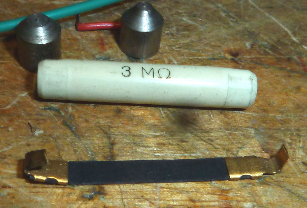 Einer der Widerstände im Glasrohr (Hersteller Loewe), rechts davon ein 1n-Kondensator von NSF (schwarzer Block):