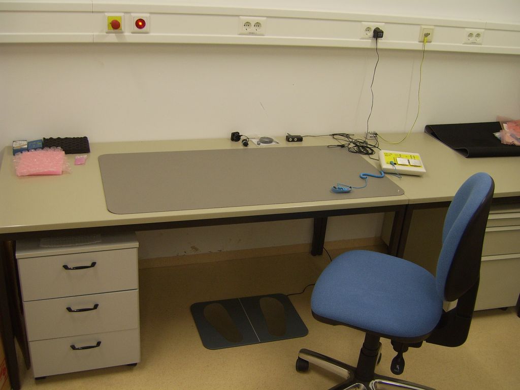 zuerst möchte ich hier erst einmal einen grossen Irrtum aus dem Weg räumen. 'Nur' eine geerdete metallische Unterlage ist nicht gut. Durch die Stuhlrollen, Gummisohlen der Schuhe und am Körper reibende Kleidung entsteht eine sehr hohe Spannung. Allein ein T-Shirt erzeugt ca. 2000V. Wenn man jetzt den Mos-Baustein auf eine geerdete Metallplatte legt, wird er vermutlich schon defekt sein, bevor er die Platte erreicht. Wichtig ist, dass man sich selbst immer auf das gleiche Potential bringt, das die Arbeitsunterlage (Tisch, Regal usw.) hat, bevor man das Bauteil ablegt. Metallunterlagen sind nicht schlecht, aber praktischer sind metallisierte Kunststoffunterlagen. Ich habe mal ein Bild davon gemacht.