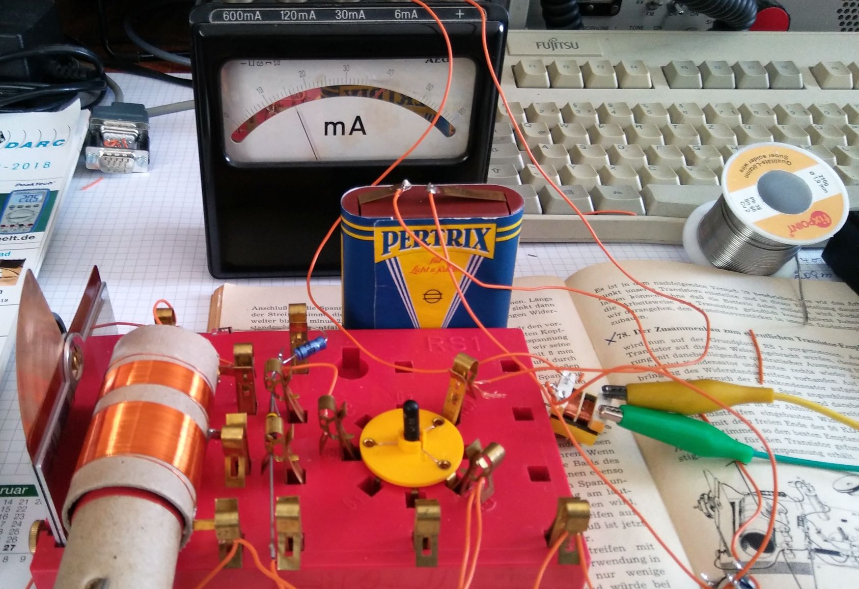 Heute früh habe ich erst einmal entspannt damit begonnen, meinen Bestand an 14 gebrauchten und 24 "neuen" Transistoren auf ihre Stromaufnahme bei 6V Collectorspannung zu prüfen. Der Basisspannungs- teiler bestand aus einem 2,5k-Poti und einem Basisvorwiderstand von 47k Ohm. In den Collector habe ich praktischerweise einen 10:1-Transformator mit einem Primärgleichstromwiderstand von 320 Ohm gelegt und einen Kopfhörer auf der Sekundärseite angeschlossen. Die Schaltung entsprach weitgehend der Radiomann Schaltung 13. Auflage 1960 von Dr. Wilhelm Fröhlich Nr. 78 auf Seite 55. Allerdings habe ich mir erlaubt, einen "richtigen" Elko und eine 1N34A als Diode zu verwenden. Die Antennen- spannung habe ich mit der Rückkopplungsspule des Experimentierkastens in den Schwingkreis einge- koppelt. Für den Sender Wawre 621 kHz ergab sich für alle 38 Transistoren eine gleich hohe Lautstärke, die in etwa einem 1-Röhren-Rückkopplungsaudion entspricht.