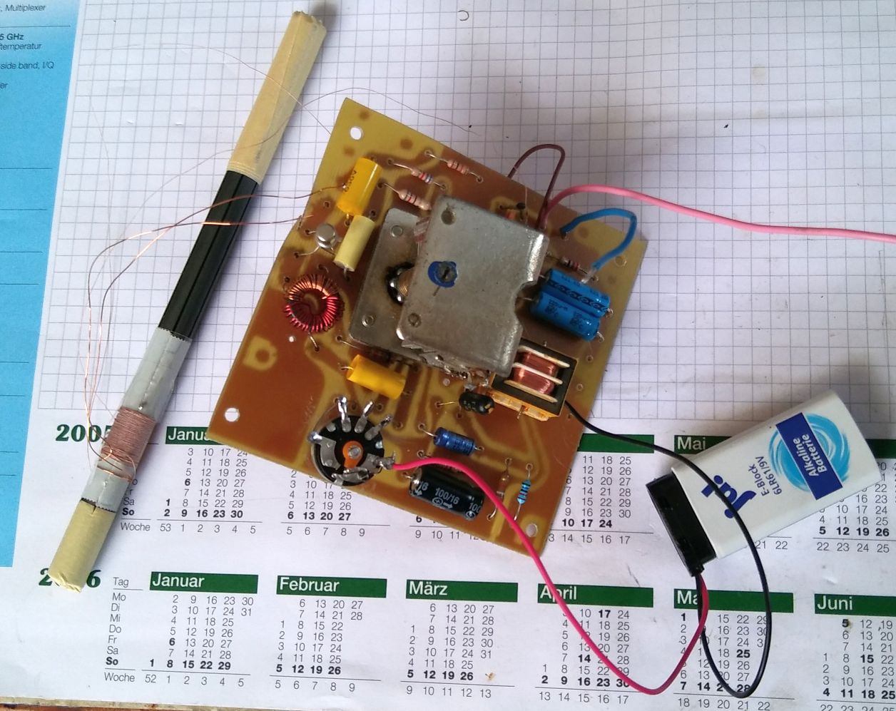 vielen Dank! Dem Eigenbau-Kamerad habe ich inzwischen die ersten Töne entlocken können. Das Originalgerät bringt schon nach dem 2. Transistor eine sehr gute Kopfhörerlautstärke mit Ferritantenne. Im Nachbau ist es erwartungsgemäß ein Problem der Transformatoren. Ein moderner Ringkernübertrager (egal welcher AL-Wert bzw. Permeabilität) funktioniert definitiv nicht. Der HF-Übertrager ist im Original von 1963 ein "bifilarer Kreuzwickelübertrager". Die altgedienten Experten können dazu vielleicht mal etwas schreiben. Wahrscheinlich hat der Übertrager in Wirklichkeit 4 Einzelwicklungen. Der Kreuzwickel soll die Wicklungskapazität minimieren, während die Bifilartechnik die Induktivität bis auf 10% drücken kann. Auf diese Weise baut man noch heute HF-taugliche Drahtwiderstände. Momentan verwende ich zwei ungeschirmte Kreuzwicklungen, die aber noch nicht optimal gekoppelt sind. Bezeichnend ist auch, dass das auf der Originalplatine aufgedruckte Trafosymbol um 90° versetzt, also letztlich falsch ist.