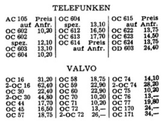 Für den OC602 gab Telefunken Alpha = 1MHz und Beta = 25 kHz an Für den OC612 wurde für Alpha der Frequenzbereich 3 ... 6 MHz angegeben, Beta-Angaben fehlten.