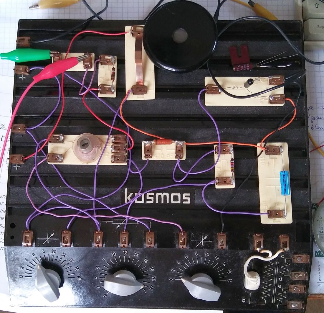 Für die Testschaltung habe ich den Kosmos-Experimentierkasten aus dem Jahr 1962 genommen. Leider schwächeln die Kontakte der Nieten der Quetschdrekos doch schon sehr. Zur Verwendung kamen OC602 orange und OC602spez rot mit exakt gleichem Beta von 32.