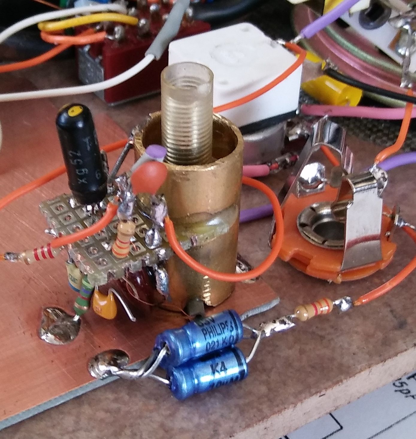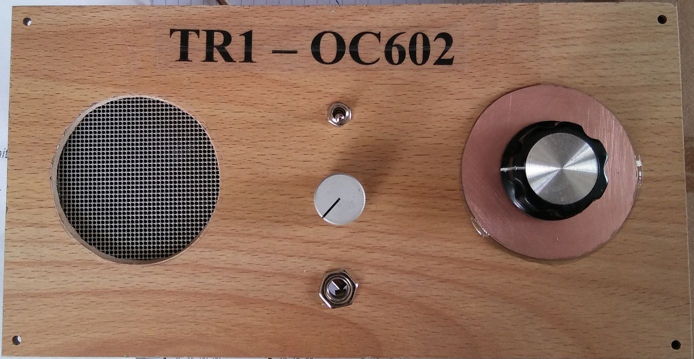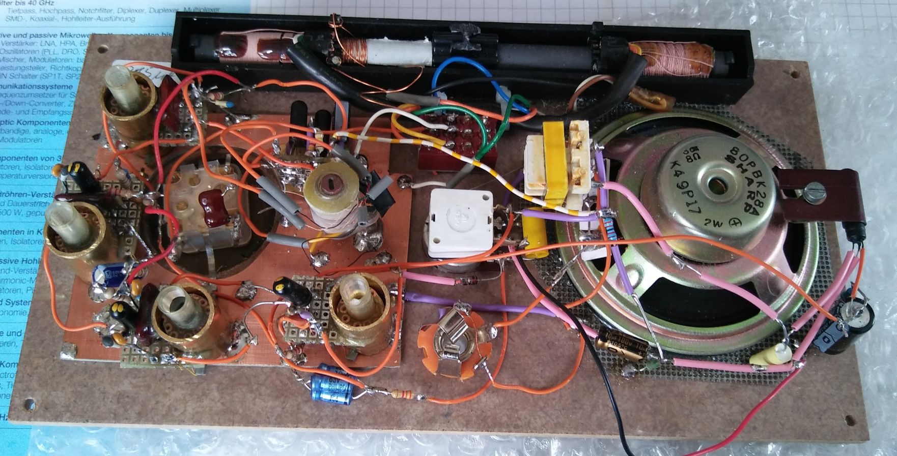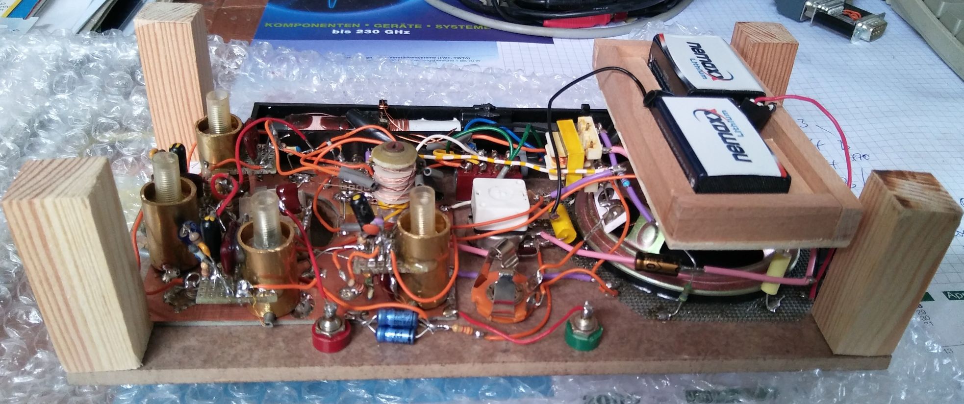 Zuerst wurde die Audio-Endstufe (bereits im Juni) in freier Verdrahtung eingebaut. Anstelle des OC604 wurde ein OC602spez verwendet, der bei unveränderter Dimensionierung des Basisspannungsteilers und Emitterwiderstands sehr gut funktioniert. Die Ruheleistungs- aufnahme liegt bei 50mW - von einem Klasse-A-Verstärker ist so verzerrungsarm kaum mehr als 20mW Output zu erwarten. Das ist keine überragende Lautstärke, aber ausreichend. Der damalige Funkschau-Artikel zur Einführung des TR1 Radios nannte eine Sprechleistung von 22mW. Für Kopfhörerbetrieb muss ich die Lautstärke in jedem Fall zurückdrehen.