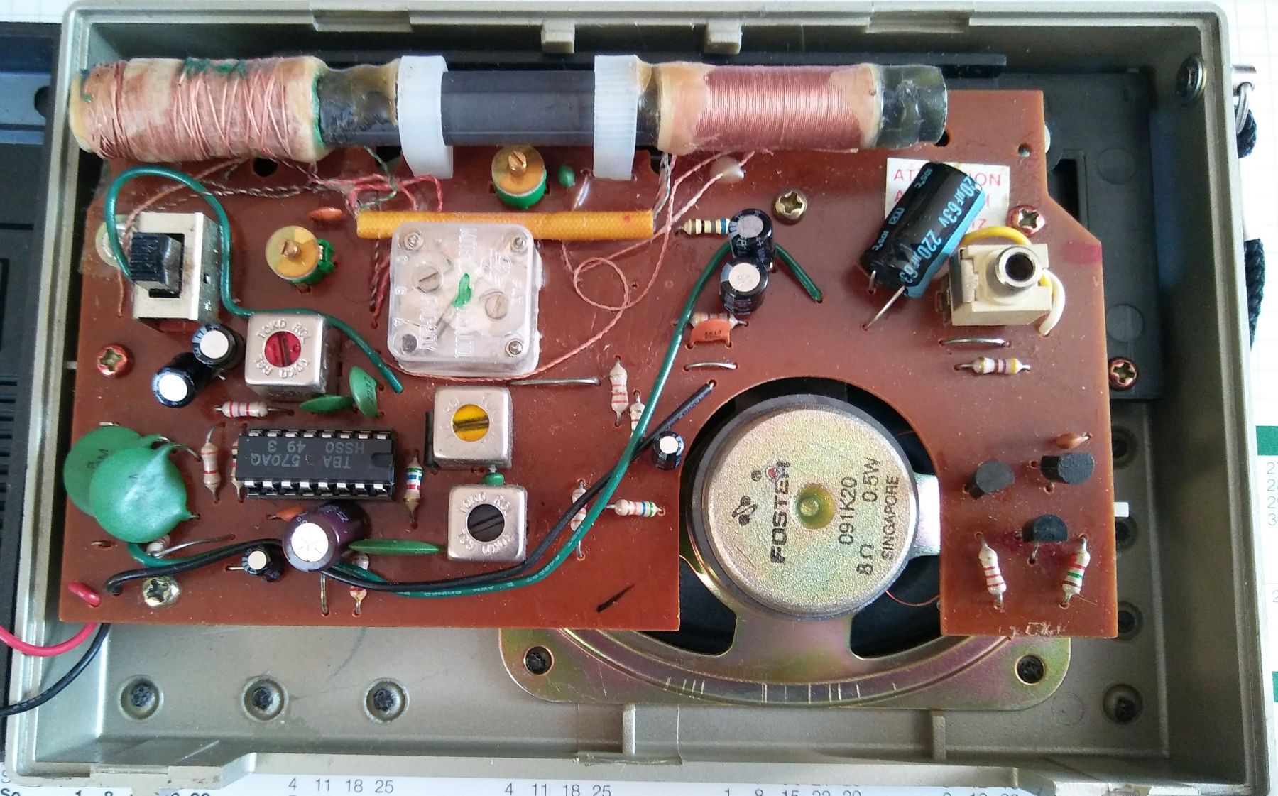 Der Abgleich der ZF-Kreise funktionierte wegen der Regelung nur mit einem Oszilloskop und nicht nach Gehör. Die resultierende Selektivität ist verglichen mit dem Telefunken Kamerad zwar besser, aber insgesamt bescheiden. Sender mit dem Abstand von 2 Kanälen = 18 kHz lassen sich aber trennen. Dafür brilliert das Gerät mit geringsten Audioverzerrungen und einem Spitzenfrequenzgang. Die Empfindlichkeit reicht zum leicht verrauschten Empfang des 200km entfernten und inzwischen in der Leistung deutlich reduzierten Senders Wawre auf 621 kHz mit Ferritantenne. Ich habe hier modernere Geräte, die diesen Sender mit Ferritantenne überhaupt nicht empfangen können. Die grösste Überraschung war der Anschluss an die Aussenantenne: Knackser und leichtes Antennenrauschen ist zu hören, aber keine Übersteuerung! Ich habe die Kopplung allerdings genauso wie im Kamerad über einen 10pF-Kondensator vorgenommen, der am heissen Ende des Abstimmkreises der Ferritantenne angeschlossen ist. Der TR1 von Telefunken benutzte damals eine Wicklung entlang des gesamten Ferrits parallel mit einem 160pF-Kondensator und verwendete die Zuleitung zum Steckernetzteil samt Lichtnetz als externe Antennenmöglichkeit. Derartige Methoden sind heute aus Störungsgründen ausgeschlossen.