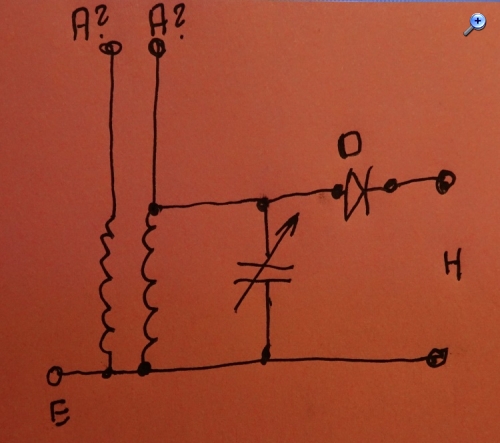 hier mal zwei Schaltbild-Varianten zusammen-gekrackelt, die ich dem Foto von Georg entnommen habe glaube (da die beiden inneren Spulenanzapf-Drähte an der Spule schwer zuordbar waren, jedenfalls ist das äußere Ende Erde: