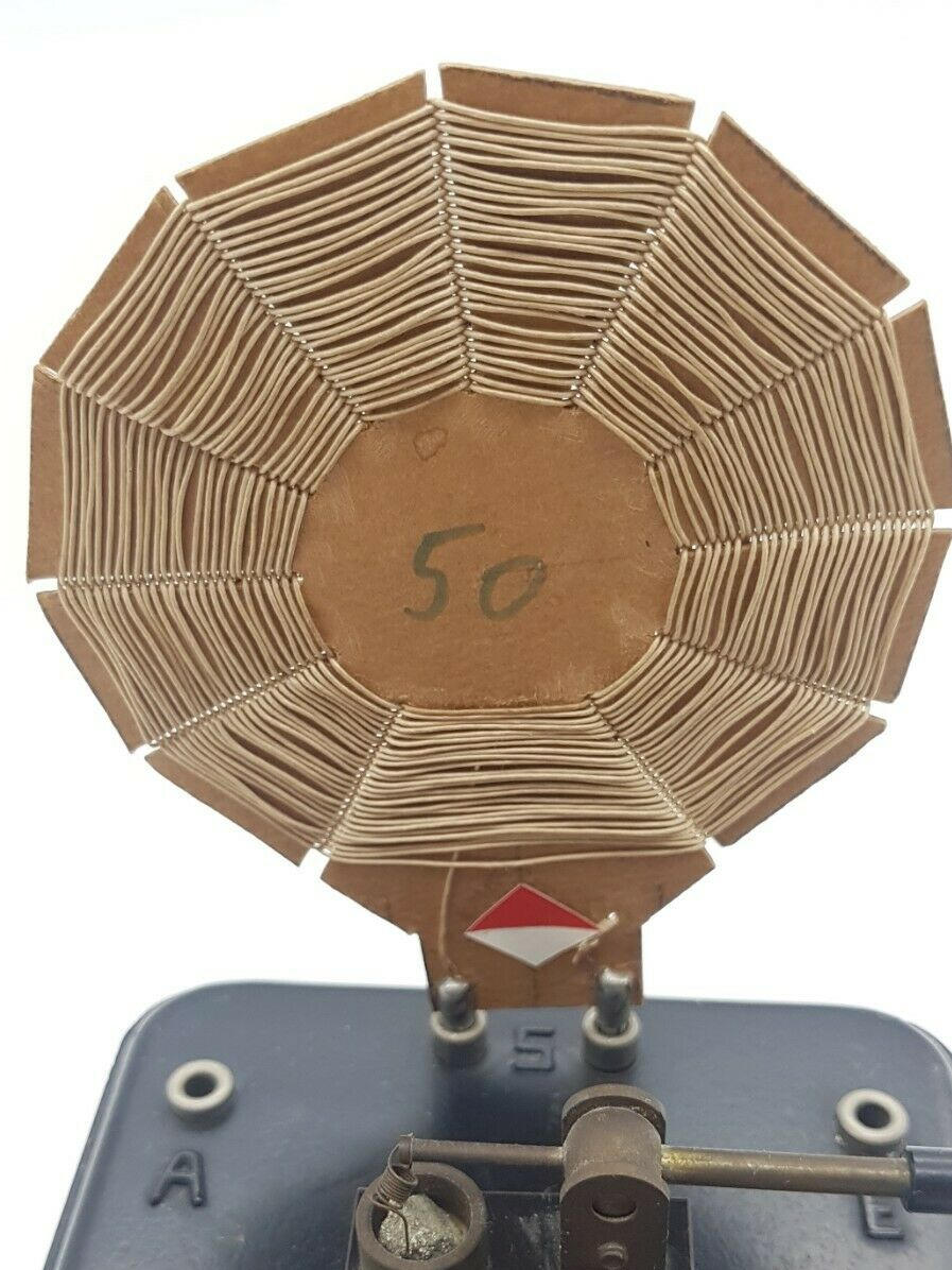das Symbol sagt mir nichts. Zum Herstellungsdatum kann ich folglich auch nichts sagen. Es gäb aber eine Methode, zu erkennen, ob es sich um eine Vorkriegsspule oder frühe Nachkriegsspule handelt: Bis ca 1950 wurden HF-Litzendrähte (es scheint sich hier um eine HF-Litze zu handeln) in dem Bündel (wie üblich) einzeln mit einem Lack umhüllt. Dieser Lack mußte beim Verlöten EINZELN abisoliert sein. Das ging bei den frühen Litzen nur mit Aufwand. Wie man das damals machte, wird hier beschrieben: