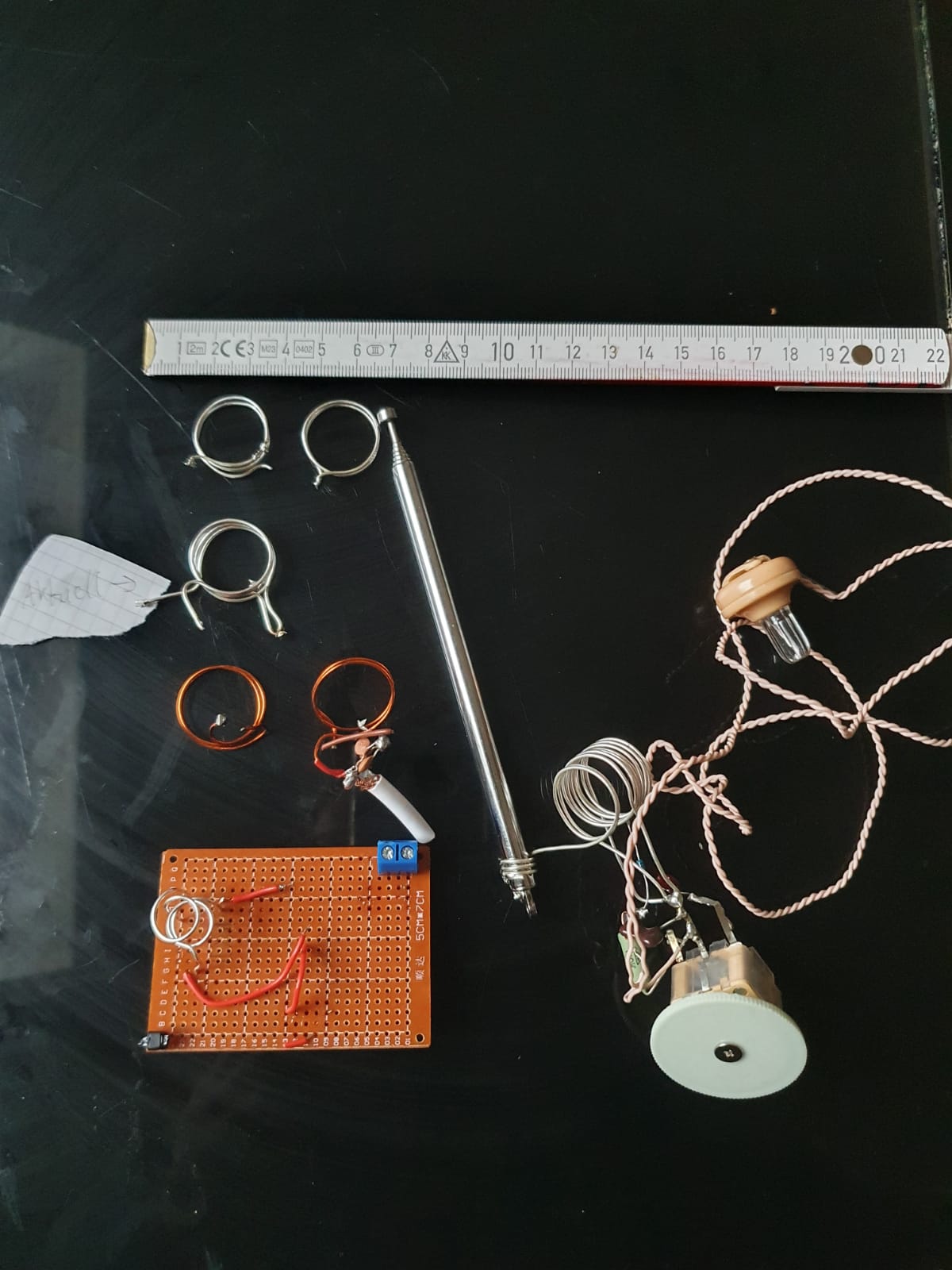 Die Spule habe ich jetzt mit 1mm Draht gemacht, aber ich habe 1,5mm bestellt und mache sie dann nochmal, wenn es unabstimmbar ist. 2cm und 2cm habe ich auch in etwa gemacht. Da lag ich ja mit Augenmaß gar nicht so schlecht.