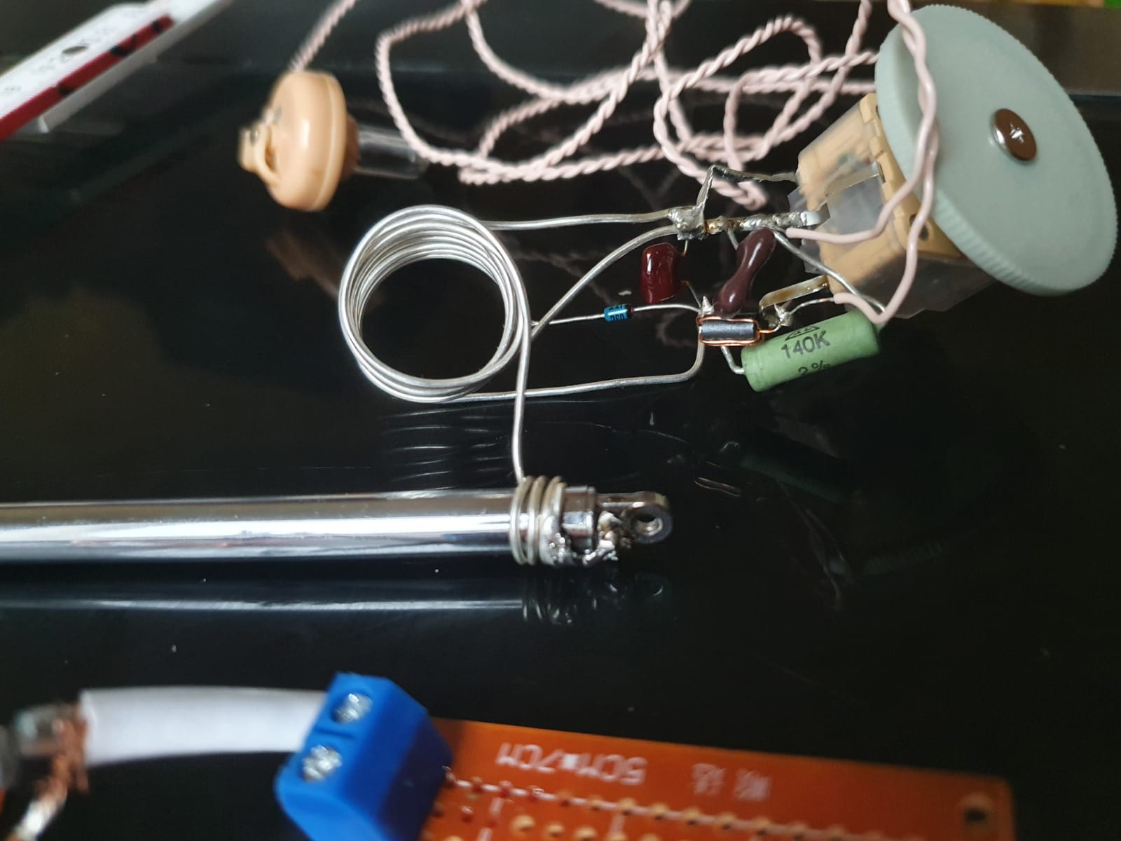 Ich hänge hier einmal ein paar Bilder von meinen Versuchen an. Der aktuelle Versuch hat: Drehko 15-35pF C1 zu COM SD103C (nicht geeignet) angezapft 1/4 Windung vor COM 90pF Glimmer Kondensator 140kOhm Widerstand VHF Choke aus einem alten Radio (Ferritkern mit 3 Wicklungen Kupfer) Kristallhörer 2cm Außendurchmesser Spule 2.25 Windungen mit Windungsabstand von 1-2mm. Diese Spule zu C1 und COM vom Drehko. Von COM zurück auf Spulenhöhe und weiter 2 Windungen, dann zur Stabantenne. Versuchsweise hatte ich eine 2. Teleskopantenne an COM und im 90 und 180° Winkel zueinander. Dann hatte ich erfahren, dass die Diode nicht geht.