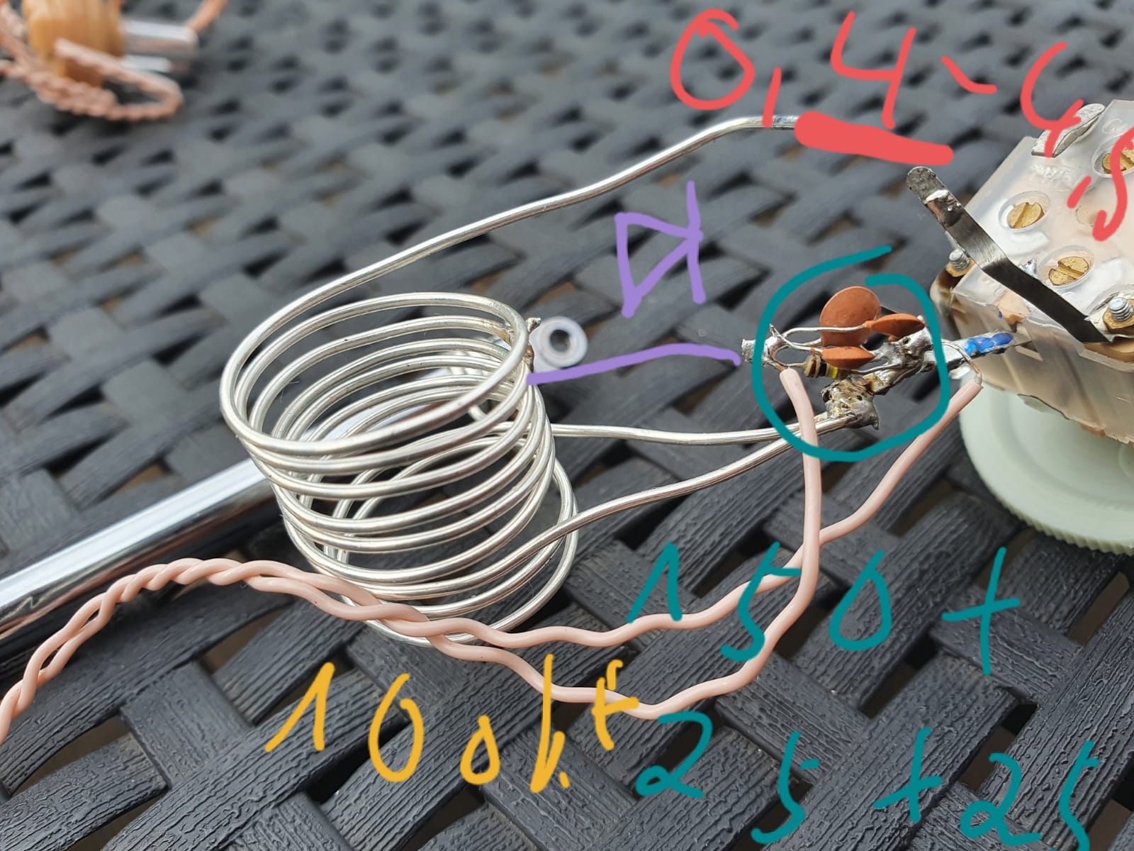 Diodenankopplung: war ,glaube ich, in der Mitte der Spule. Aber auch eine Kopplung an die 2. Windung könnte funktionieren. Nicht so kritisch. Auch die Diode hat eine Eigenkapazität, die sich umso stärker in den Schwingkreis transformiert, je höher die Diode (von Masse aus gesehen) an der Spule angekoppelt ist.