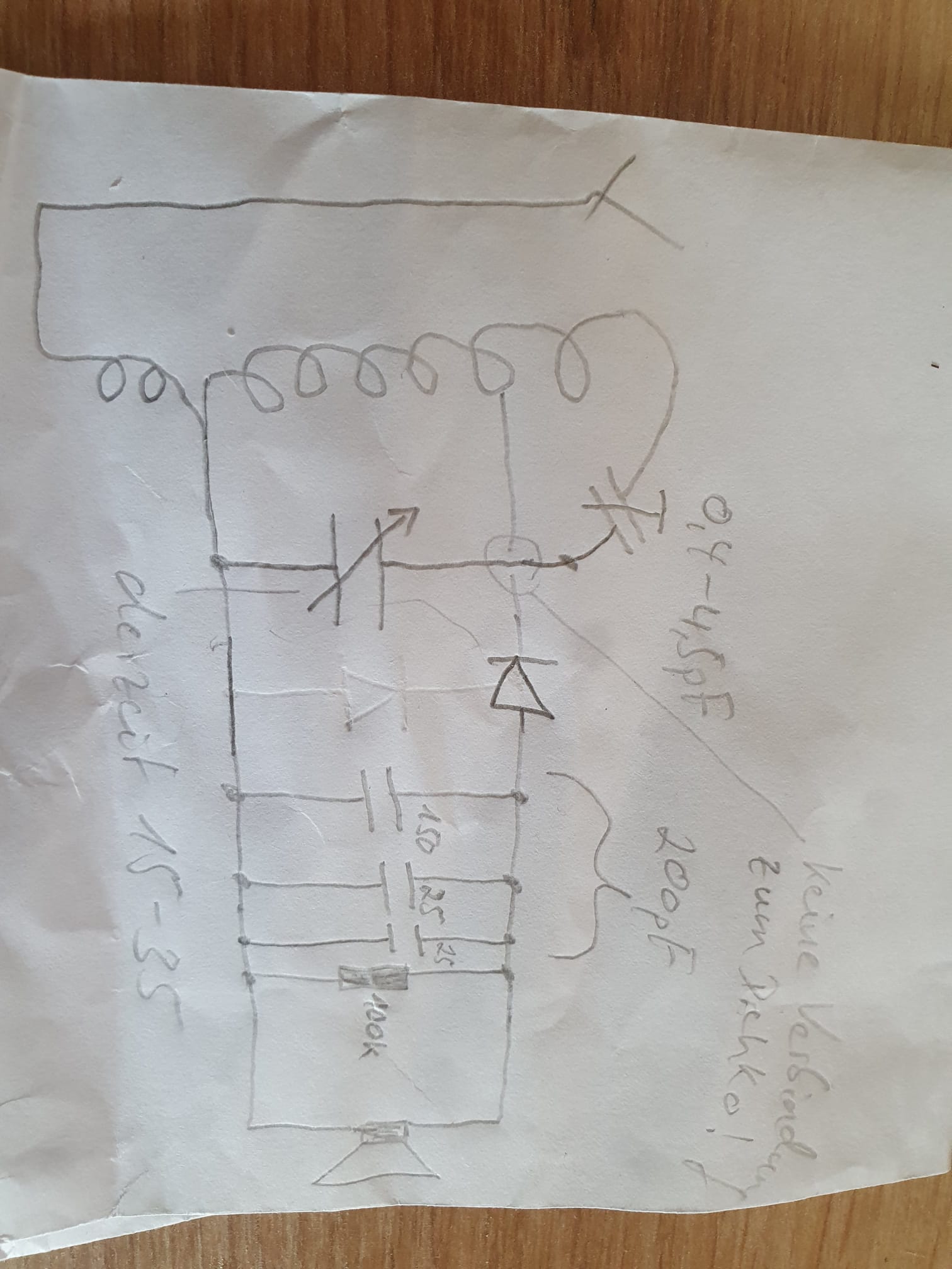 Ich habe mir jetzt auch 150pF, 25pF und 25pF parallel einen 200pF Kondensator gemacht. War das eine gute Idee? Den auf der einen Seite mit COM vom Drehko und an der anderen kommt dann die Diode. Die dann wieder an die Spule 2 Windungen .