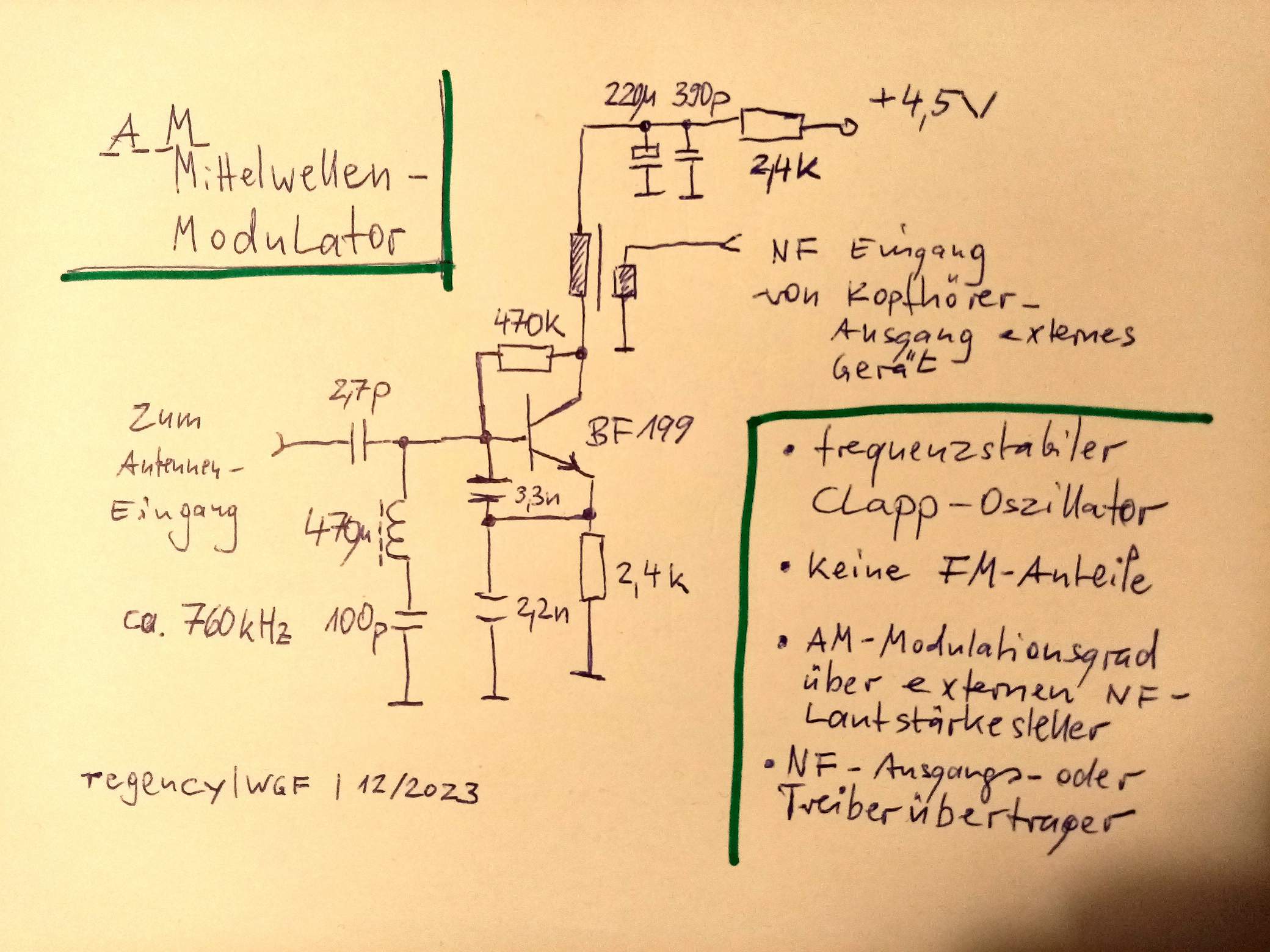 Die Besonderheit meiner Schaltung ist zum einen der Clapp-Oszillator, der bei Änderung der Versorgungsspannung zwar die HF Amplitude proportional ändert, aber die Frequenz stabil hält. Zum anderen der Ausgangs-NF-Trafo, der hier den niederohmigen Kopfhörerausgang für die AM herauf transformiert.