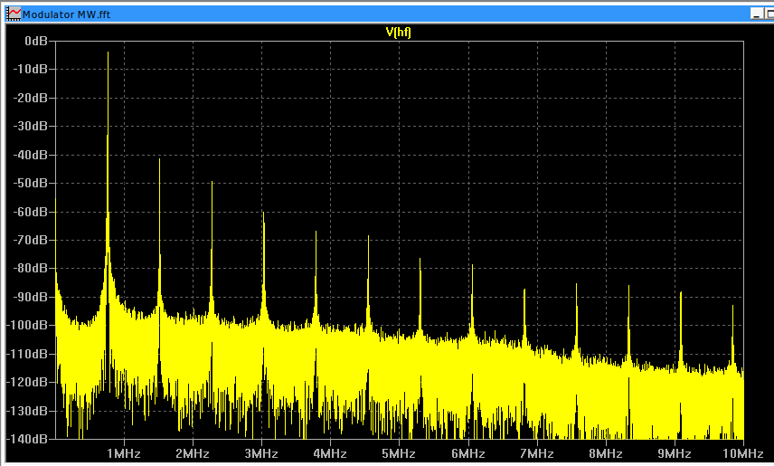 Habe die Schaltung neugierigerweise mal in der Sim betrachtet. Bei moderatem Modulationsgrad sieht das ganz gut aus. Die erste Oberwelle ist knapp 40dB gedämpft, das sollte auch passen. Bei der HF-Ausbeute könnte man das durchaus auch als Heimsenderlein nutzen. Als Trafo ist ein kleiner 1:10 Printtrafo angenommen, der NF Pegel beträgt 500mVss / 1kHz.