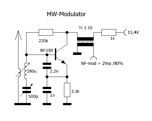 Da die Mittelwelle in Deutschland zu empfangen kaum noch Spass macht, diese alten Radios aber ihren besonderen Reiz haben, will ich einen kleinen Modulator bauen. Die Frequenz soll stabil sein, keine FM Anteile haben. Als Audioquelle dient ein UKW-Radio oder ein Handy bzw. mp3-Player mit Kopfhörerausgang. Es wird direkt über die Antennenbuchse eingespeist. Die äußerst geringe Abstrahlung ist zu vernachlässigen.